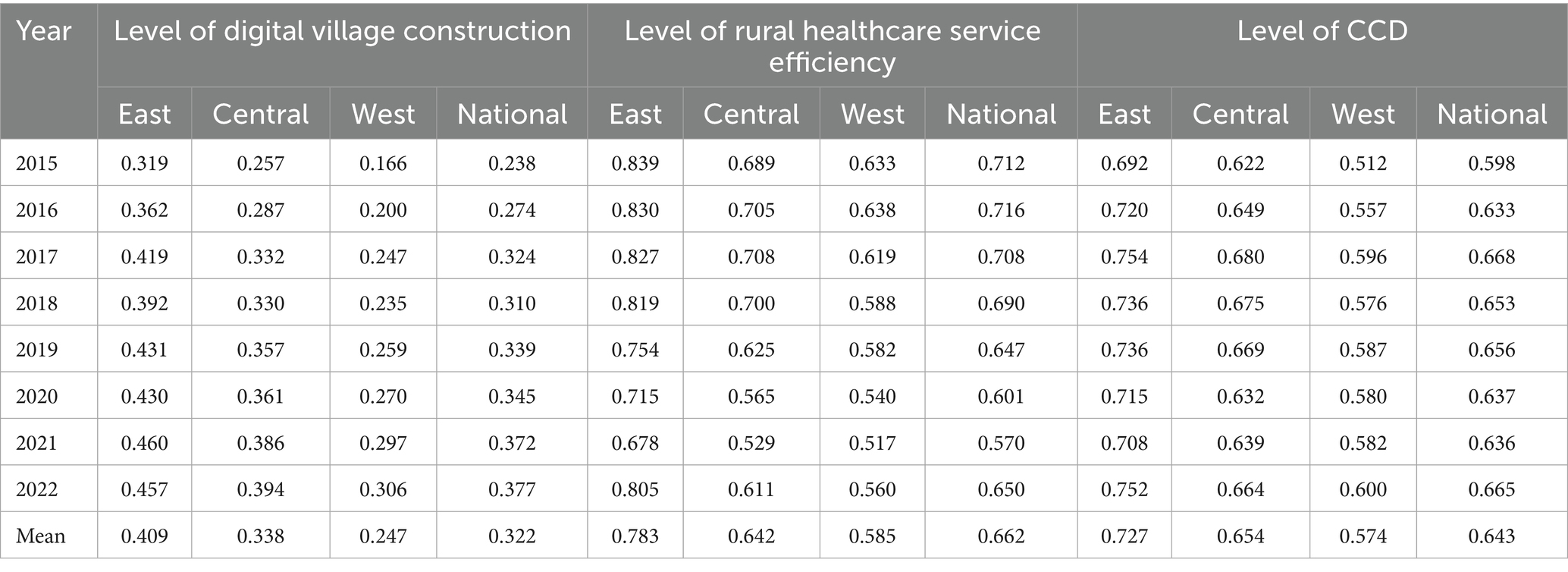 Table 5. Level of digital village construction, level of rural healthcare service efficiency, and the CCD from 2015 to 2022.