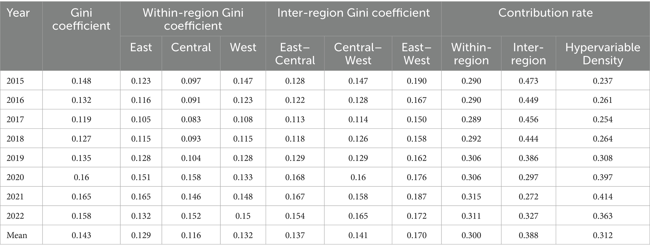 The CCD between China’s digital village construction and rural healthcare service efficiency exhibits a distinct spatial differentiation pattern. To further analyse the sources of this spatial differentiation pattern, this study uses the Gini coefficient decomposition method to examine the regional heterogeneity of the CCD between two systems. The result is shown in Table 6.