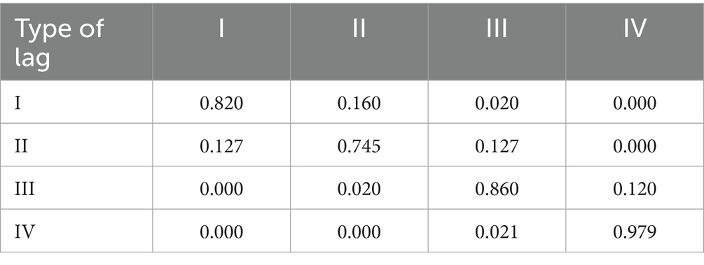 Traditional Markov analysis treats each region as an independent unit when reflecting the transitional characteristics of the CCD between digital village construction and rural healthcare service efficiency in different regions, without considering the influence of surrounding adjacent types on their evolution (63). Therefore, this study employed a spatial adjacency weight matrix to analyze the global Moran’s I index, assessing the CCD between digital village development and rural healthcare efficiency from 2015 to 2022. The findings reveal that all p-values for the global Moran’s I index fall below 0.05, demonstrating a statistically significant and spatially clustered relationship between these two factors across China (The calculation results are shown in Supplementary material). Therefore, incorporating the spatial factor into the study’s scope is necessary for developing a spatial Markov transition probability model. The calculation results are shown in Table 8.