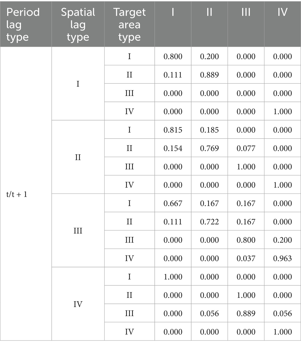 The kernel density estimation technique is limited to offering a basic depiction of how the CCD between digital village development and the effectiveness of rural healthcare services fluctuates over time. However, it lacks the capability to delve into the spatial patterns and characteristics of their distribution dynamics. The advantage of the Markov chain method lies in providing dynamic information on regional movements within the distribution (62). Therefore, this study employs conventional and spatial Markov transition probability matrices. Using a quartile classification approach, the CCD is categorized into four distinct tiers: low (k = I), medium-low (k = II), medium-high (k = III), and high (k = IV). The traditional Markov transition probability matrix is shown in Table 7.