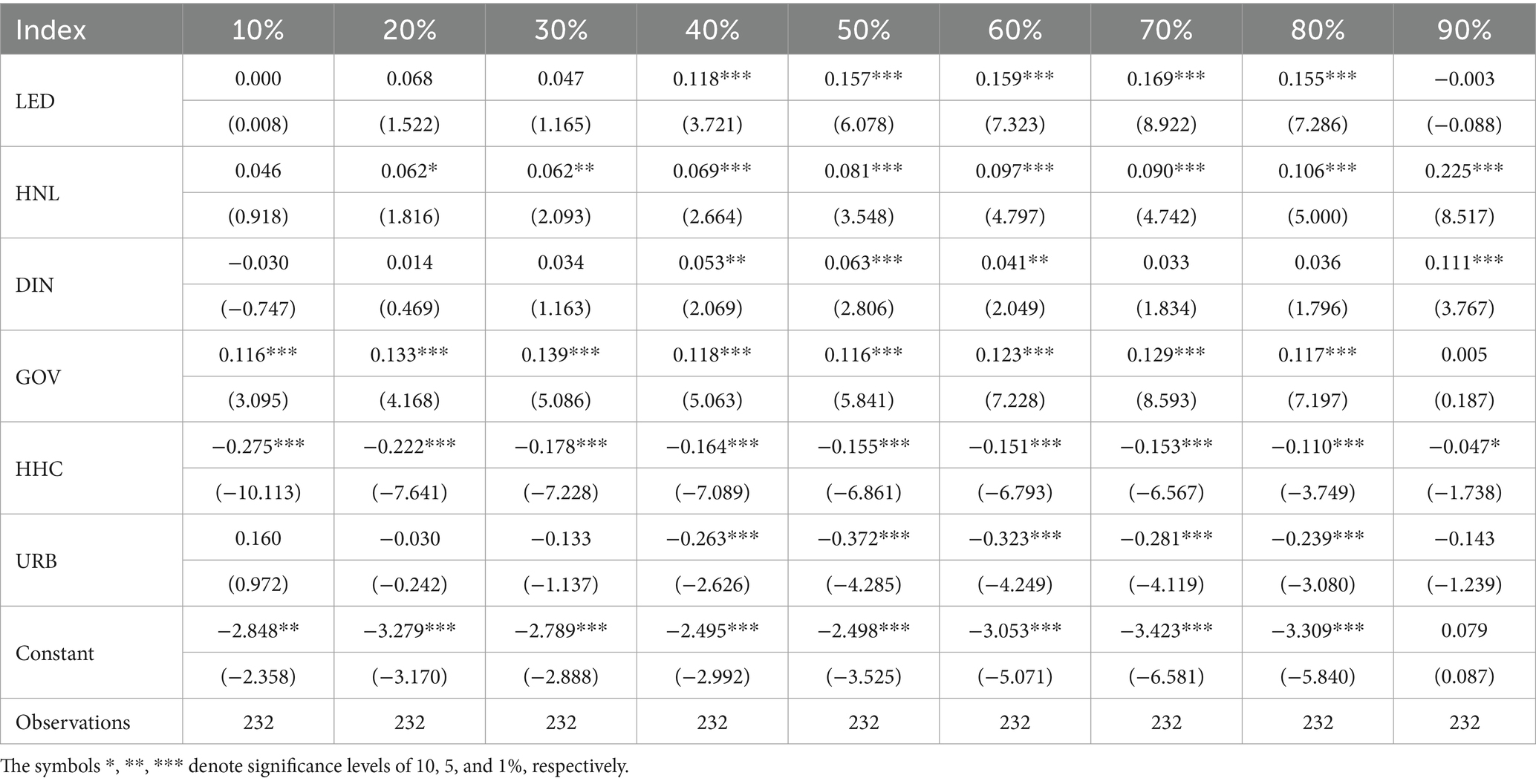 Table 9 presents the results of quantile regression analysis. LED, GOV, HDI, and DIN all have a significant positive impact on CCD. Specifically, the β coefficients for LED in the 0.4 to 0.8 quantile fluctuate between 0.118 and 0.169, showing a trend of first increasing and then decreasing. All coefficients pass the 1% significance test. This indicates that economic development levels have a positive effect on CCD, with higher economic development levels leading to higher CCD. HNL have a positive impact on CCD. In the 0.2–0.9 quantile, the trend is generally increasing. The β coefficients range from 0.062 to 0.225. DIN has a significant positive impact on CCD at the 0.4–0.9 quantile, with β coefficients ranging from 0.041 to 0.111, all passing the significance test at the 5% level, indicating that as digital innovation capacity improves, CCD also increases accordingly. GOV has a significant positive impact on CCD at the 0.1–0.8 quantile, with its β coefficient fluctuating between 0.117 and 0.139, indicating that increases in government health expenditure can promote an increase in CCD. Additionally, the results indicate that HHC and URB have a negative impact on CCD. Specifically, HHC has a significant negative impact on CCD at the 0.1–0.9 quantile, with its β coefficient fluctuating between −0.110 and −0.275 and showing a decreasing trend. While URB only have a significant positive impact on CCD at the 0.4–0.8 quantile, with the β coefficient fluctuating between −0.239 and −0.372, showing an initial increase followed by a decrease.