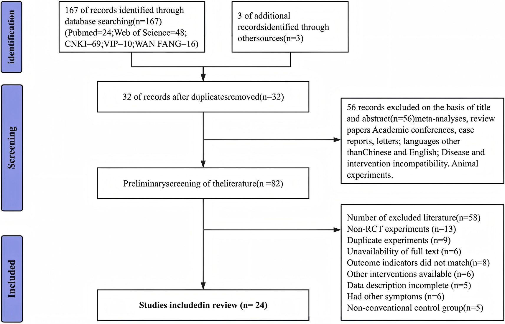 The PRISMA flowchart illustrates the research selection process, as shown in Figure 1. Systematically retrieve databases using pre-defined retrieval strategies. A preliminary search has identified 170 potential studies. After using EndNote software for database management and deleting 32 duplicate studies, there are still 82 studies. After independent screening of titles, abstracts, and complete manuscripts by three researchers, a total of 24 studies were included in the final analysis, including both English and Chinese literature.