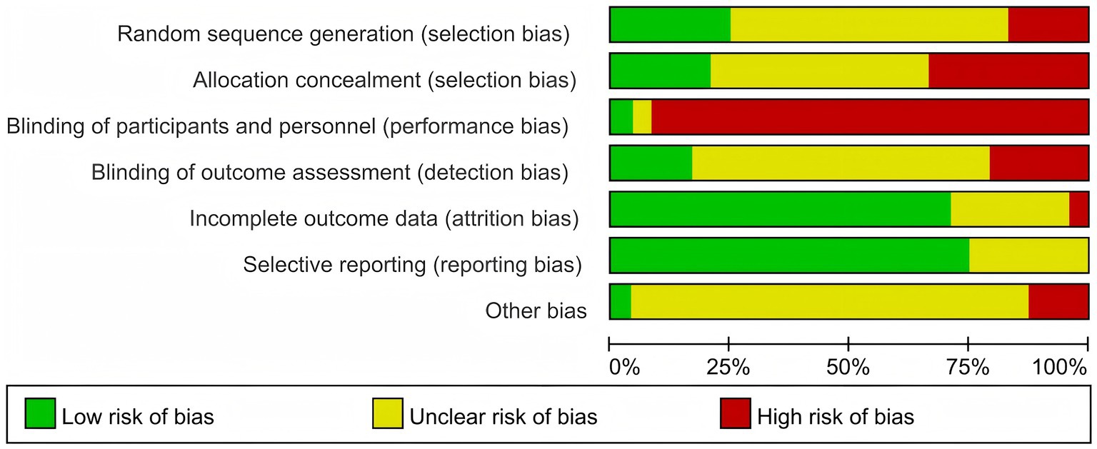 Figures 2, 3 show detailed information on bias risk assessment. Among the 24 studies included, 3 (12.5%) were assessed as low-risk, 11 (45.8%) had certain issues, and 10 (41.7%) showed high-risk bias. From the perspective of bias types, implementation bias is the most prominent, with about 95% of studies showing a high risk of participant and researcher blinding. This is due to the inherent characteristics of mental health intervention research, as participants and implementers often cannot completely blind intervention types. It is worth noting that the risk of incomplete outcome data (loss bias) and selective reporting (report bias) is relatively low, with approximately 70–80% of studies rated as low-risk, indicating good methodological quality in terms of data integrity and reporting transparency. There is a certain proportion of unclear risk (about 50%) in the blind methods of random sequence generation, allocation concealment, and result evaluation, mainly due to insufficient details in the original research report rather than substantial flaws in the research design.