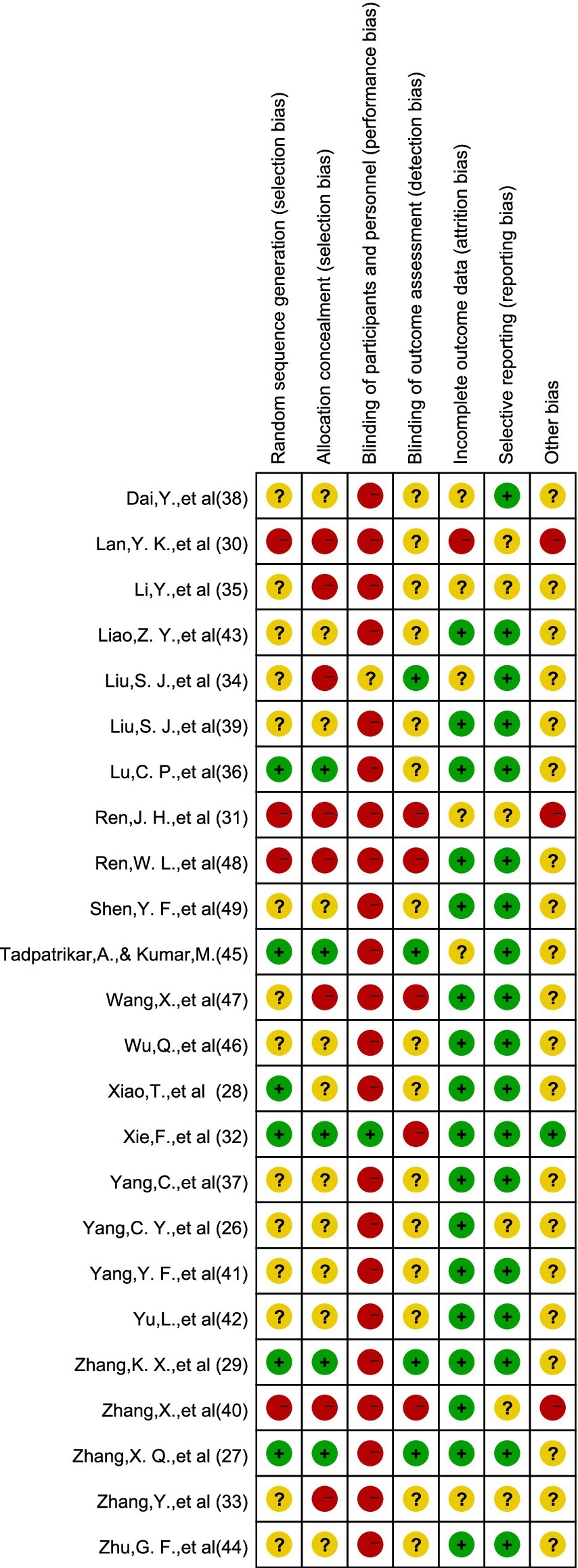 The research quality rating adopts a three-level standard: those who fully meet the standard are marked as “+,” indicating low-risk bias; Those who completely do not meet the criteria are marked as “-,” indicating high-risk bias; Those who do not explicitly describe relevant information in the literature are marked with “?,” indicating unknown risk bias. If the results of two researchers are inconsistent during the evaluation process, the third researcher will participate in the discussion.