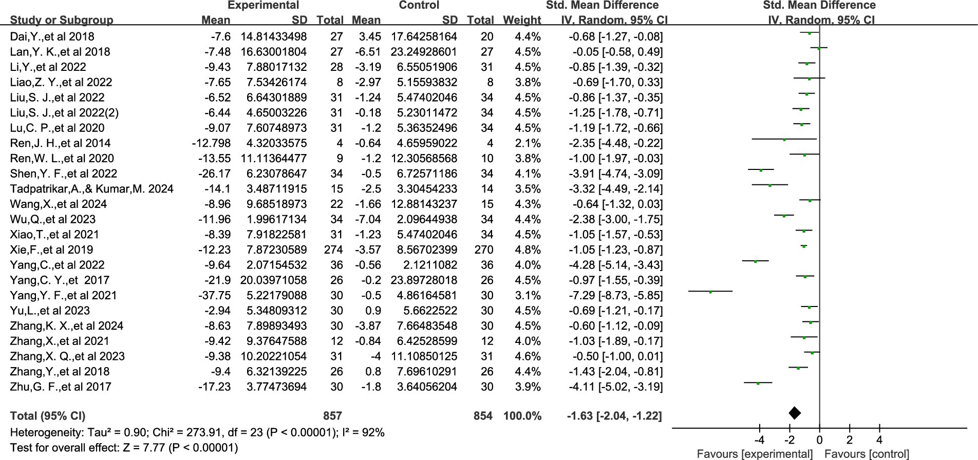 A meta-analysis of 24 controlled studies was also conducted (N = 1,711). The overall results of the meta-analysis are presented in Figure 4. Compared with the control group, we found that the experimental intervention had a significant effect on reducing the primary outcome measure (SMD = −1.63, 95% CI: −2.04, −1.22). The I2 statistic showed substantial heterogeneity (I2 = 92%, df = 23, p < 0.00001). Analysis of the forest plot shows that all included studies demonstrated negative effect values, indicating a consistent direction of effect for the intervention. The most significant effect was observed in Yang, Y. F., et al., 2021 (SMD = −7.29, 95% CI: −8.73, −5.85), while the smallest effect was found in Lan, Y. K., et al., 2018 (SMD = −0.05, 95% CI: −0.58, 0.49). Given the high heterogeneity, we employed a random-effects model for analysis, with an overall effect test of Z = 7.77 (p < 0.00001), indicating that the intervention effect was statistically significant.