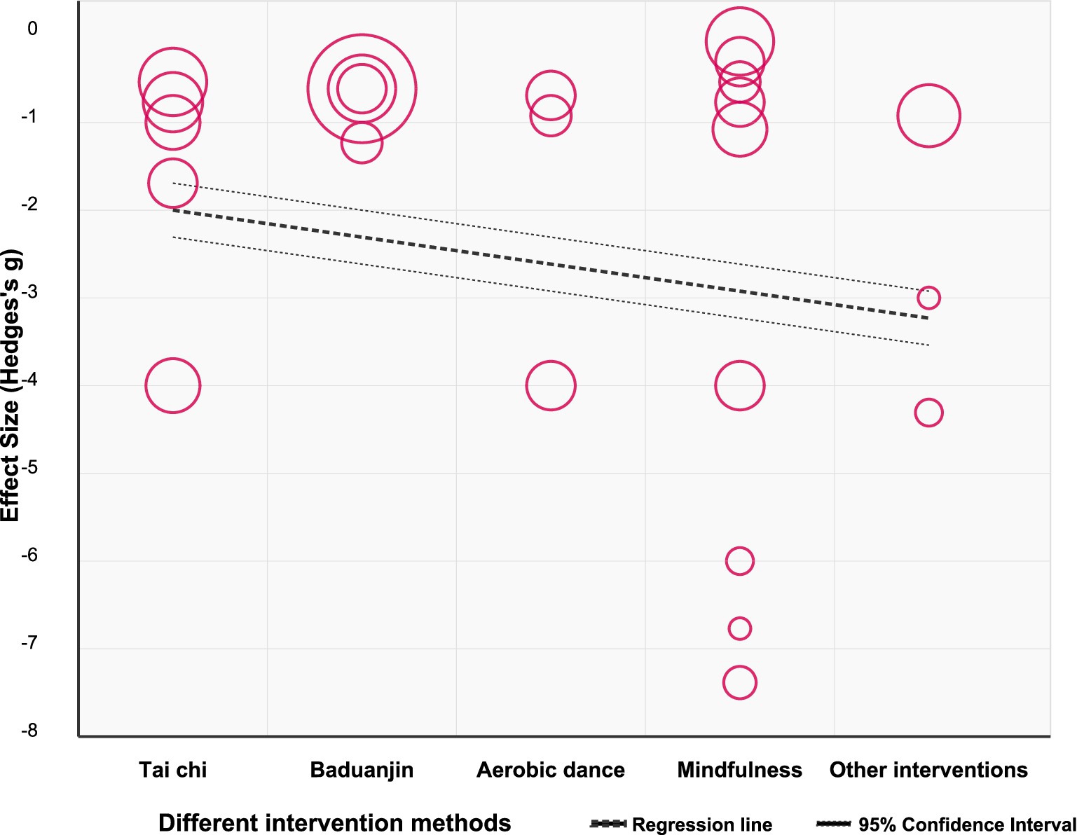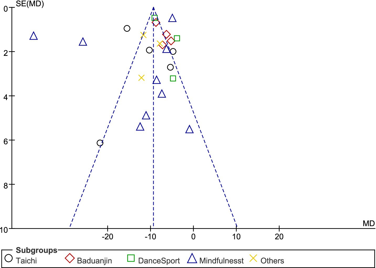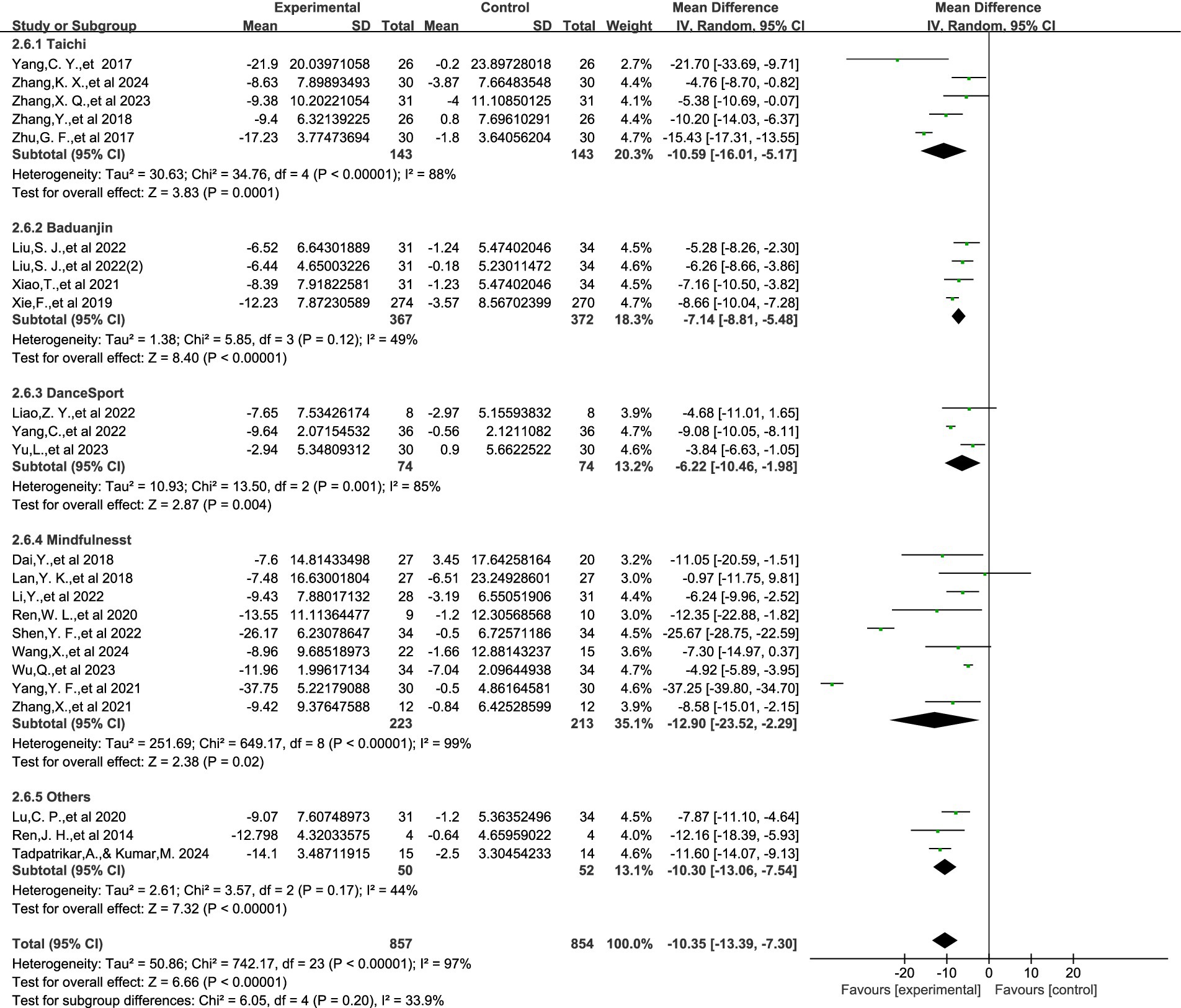Although the effect of Ba Duan Jin [SMD = −7.14, 95% CI (−8.81, −5.48)] is relatively small, it has a narrow confidence interval and low heterogeneity (I2 = 49%), providing the most accurate and reliable estimate. Given the instability of some subgroup findings, these comparative effectiveness results should be considered preliminary rather than definitive, and future research with larger samples is needed to confirm potential differential effects between mind–body exercise modalities.