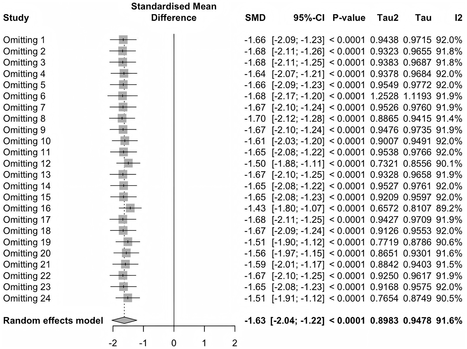 Sensitivity analysis showed that regardless of which study was excluded (Figure 7), the standardized mean deviation (SMD) remained between −1.43 and −1.70, with p values < 0.0001, indicating consistent statistical significance.
