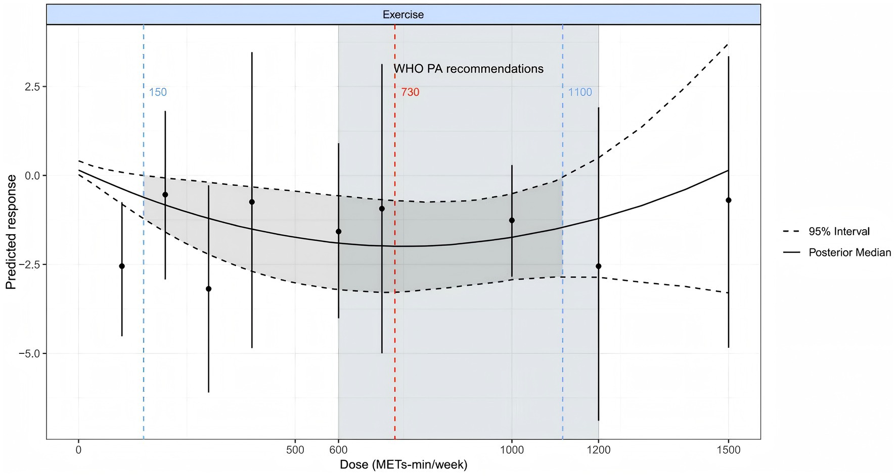 The overall dose-response relationship between exercise dosage and internet addiction exhibits a non-linear dose-dependent U-shaped curve (Figure 9). When exercise dosage is below the threshold of 150 MET min/week (blue dashed line on the left), therapeutic efficacy for IAD symptomatology demonstrates limited magnitude with substantial response variability; as dosage parameters increase, therapeutic efficacy exhibits progressive enhancement, reaching optimal efficacy at 730 MET min/week; upon exceeding the threshold of 1,100 MET min/week (blue dashed line on the right), marginal therapeutic benefit demonstrates significant attenuation, with concomitant expansion of the 95% confidence interval (dashed boundary), indicating increased outcome uncertainty in high-dosage regimens. At a weekly level of 600MET [the recommended lower limit of physical activity for energy expenditure by the World Health Organization (54)], the predictive effect was high (SMD = −1.92, 95% Crl −3.22, −0.58, SD = 0.67). Similarly, at 1200 METmin/week (the recommended upper limit for energy expenditure and physical activity by the World Health Organization), the predictive effect is moderate (SMD = −1.20, 95% Crl −2.86, 0.49, SD = 0.86), but the SD value is larger. The optimal intervention effect was achieved at 730MET per week (SMD = −1.99, 95% CrI −3.28, −0.71, SD = 0.65).
