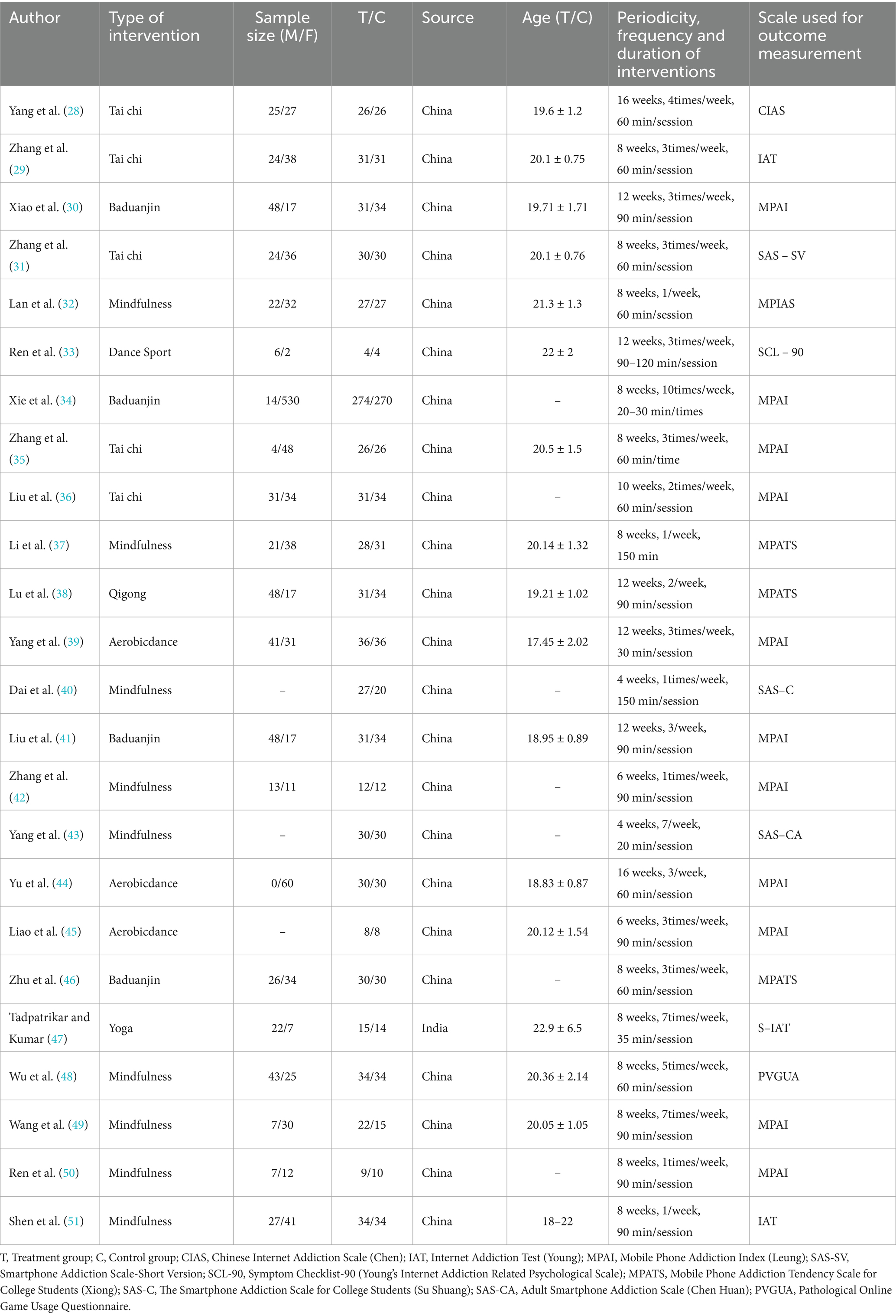 The study included 24 studies conducted between 2000 and 2025, involving 1,711 young Adults aged 18–24 with a median age of 24. Sports interventions include intervention forms such as Tai Chi, Baduanjin, Mindfulness, Aerobicdance, sports dance, and yoga. Specifically, 143 participants from 5 research groups received Tai Chi, 367 participants from 4 research groups received Baduanjin, 223 participants from 9 research groups received mindfulness meditation, 74 participants from 3 research groups received aerobic fitness exercises, 4 participants from 1 research group received sports dance, 15 participants from 1 research group received yoga, and 31 participants from 1 research group received qigong. The intervention duration ranges from 4 weeks to 16 weeks, with a median duration of 10 weeks. The intervention frequency is 1–10 times per week, with a median frequency of 5.5 times. The duration of each session is 30–150 min, with a median duration of 90 min. The detailed features included in the study are shown in Table 2.