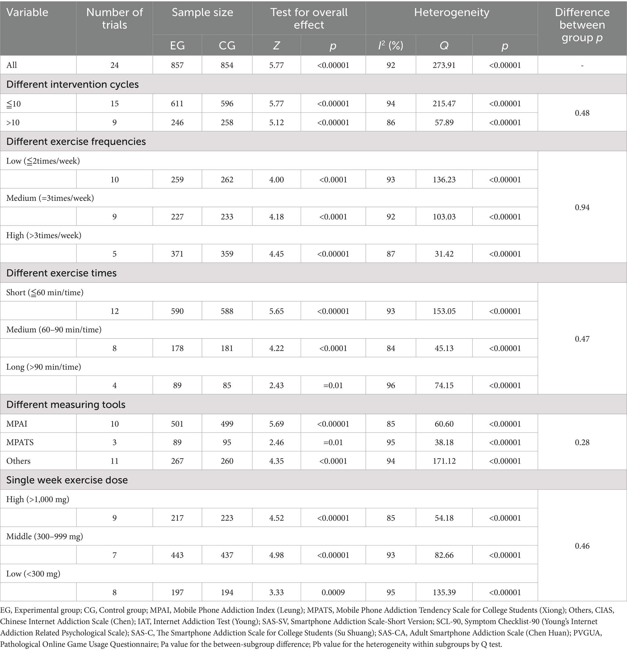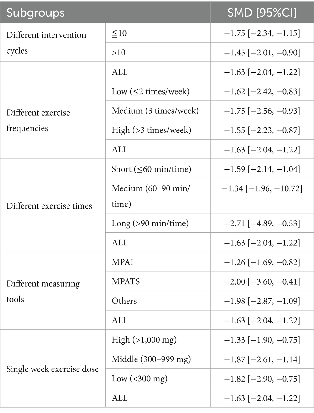 The study conducted subgroup analysis based on “exercise frequency, exercise time, intervention cycle, measurement tools, and intervention intensity.” The analysis results are shown in Table 2.