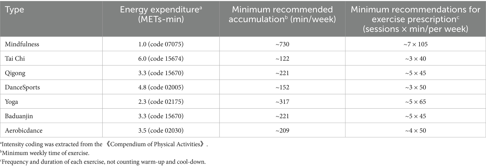 According to pre-defined categories, the included exercise intervention programs are coded as TC (Tai Chi), BDJ (Baduanjin), MF (Mindfulness), DS (DanceSports), QG (Qigong), AD (Aerobicdance), YG (Yoga). We quantified intervention intensity using metabolic equivalent of task (MET) values, where 1 MET represents energy expenditure at rest. MET values were assigned to each intervention based on the 2024 Adult Physical Activity Guidelines (16), the American College of Sports Medicine Exercise Testing and Prescription Guidelines (17), and clinical exercise dosage literature (18). Specifically, we assigned: TC = 3.0 METs, BDJ = 2.5 METs, MF = 1.5 METs, DS = 4.5 METs, QG = 2.5 METs, AD = 5.0 METs, and YG = 3.0 METs. For mindfulness, which is not traditionally measured in METs, we used values from similar seated, focused attention activities. Daily dose was calculated as MET × daily intervention time, and weekly dose as weekly frequency × daily dose. To ensure network connectivity for analysis, we classified interventions into standardized weekly dosage categories: 0 (CG), 100, 200, 300, 400, 500, 600, 700, 1,000, 1,200 METs·min/week.
