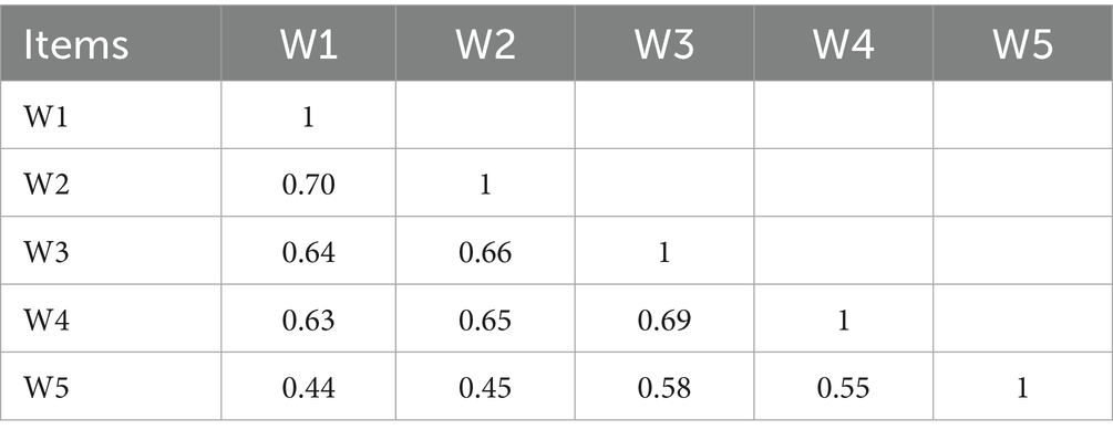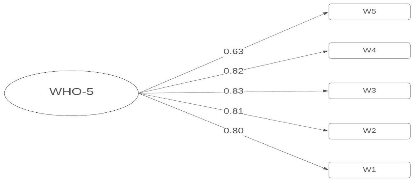 Table 1 presents the polychoric correlations obtained among the five items of the WHO-5 well-being index. Polychoric correlations are appropriate for evaluating the relationship between ordinal categorical variables, as is the case with Likert-scale items. The correlations ranged from 0.44 (W1 and W5) to 0.70 (W1 and W2), indicating moderate to high levels of association among the items. These values show that there is no problem of collinearity, meaning that redundancy between items is not present (88). This pattern suggests that the items are interrelated, reflecting a possible unidimensional structure of the evaluated construct. These findings support the internal consistency of the instrument and suggest that the items measure related aspects of the same construct.
