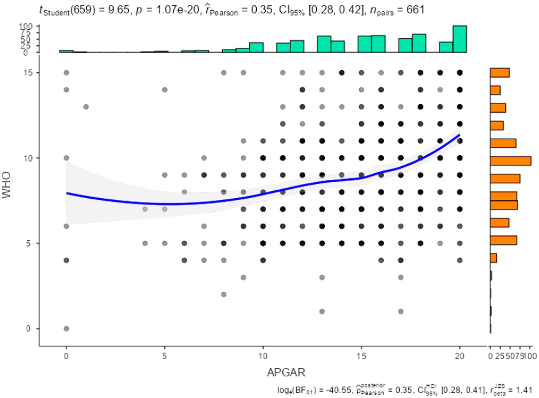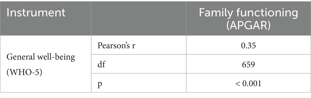 Table 5 and Figure 2 show the correlation between the Family Functioning scale (APGAR) and the WHO-5 well-being index, revealing a statistically significant and positive correlation (r = 0.35). This provides evidence of convergence between the constructs measured by the two instruments.