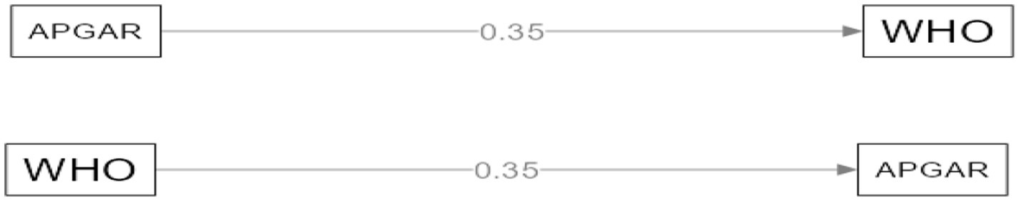 Figure 3. Path analysis evaluating the predictive capacity of both variables on each other. Funcionalidad familiar (APGAR); Bienestar general (WHO-5).