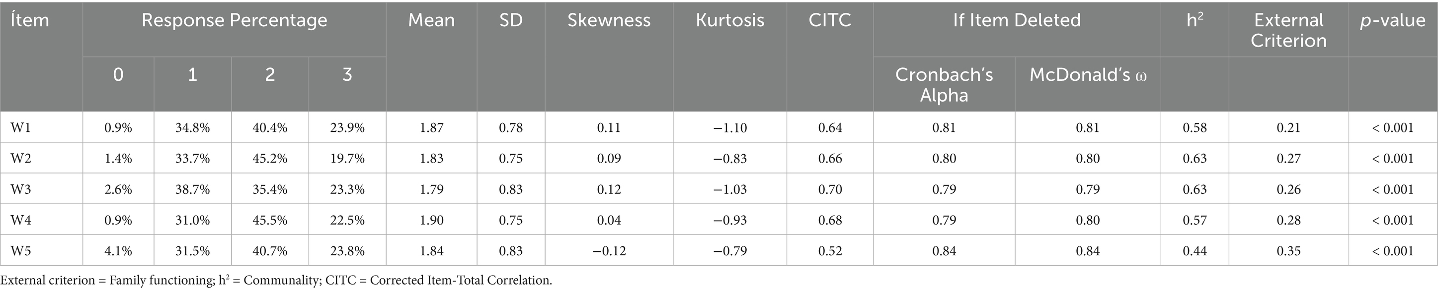 In terms of psychometric quality, the corrected item-total correlation (CITC), communality (h2), and the impact of deleting each item on the internal consistency of the instrument were evaluated. CITC values ranged from 0.52 (W5) to 0.70 (W3), indicating that most items adequately contribute to the overall construct (84, 91). Communalities were all above 0.30, indicating shared variance among items (92). The deletion of any item did not significantly affect internal consistency coefficients (Cronbach’s α and McDonald’s ω), which remained high across all cases, evidencing the reliability of the instrument (80, 93). Finally, correlations with the external criterion (Family functioning) were examined, showing significant associations (p < 0.001) for all items, supporting the criterion validity of the WHO-5.