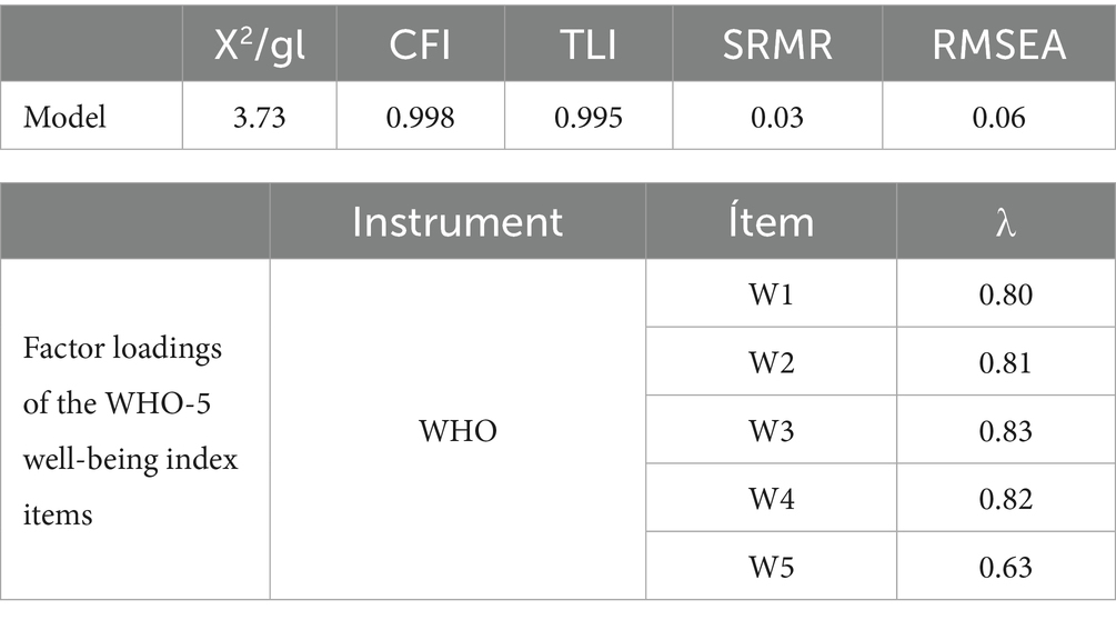 Table 3 shows the results of the confirmatory factor analysis (CFA) of the WHO-5 well-being index, using the WLSMV estimator, which is appropriate for ordinal data. The global fit indices indicate an excellent fit of the proposed unidimensional model. The chi-square statistic divided by degrees of freedom (χ2/df = 3.73) is acceptable and consistent with reasonable fit. The Comparative Fit Index (CFI = 0.998) and Tucker–Lewis Index (TLI = 0.995) are above the 0.95 threshold, providing evidence of very good model fit. The error indices, both SRMR (0.03) and RMSEA (0.06), are also within the recommended values (< 0.08 and < 0.06, respectively), suggesting a low level of discrepancy between the model and the data (83, 94, 95).