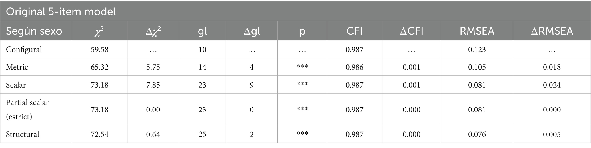 Table 4. Fit indices of the factorial invariance analysis of the WHO-5 well-being index (original 5-item model) by sex.