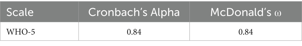 Table 6 presents the reliability indices of the WHO-5 well-being index. Cronbach’s alpha, with a value of 0.84, indicates a high level of internal consistency, reflecting strong interrelations among the items and a consistent measurement of the general well-being construct. Similarly, McDonald’s omega, also with a value of 0.84, demonstrates a high level of reliability, confirming the robustness of the instrument in measuring this construct. In all cases, the values exceed 0.70, which is considered acceptable (97–99).