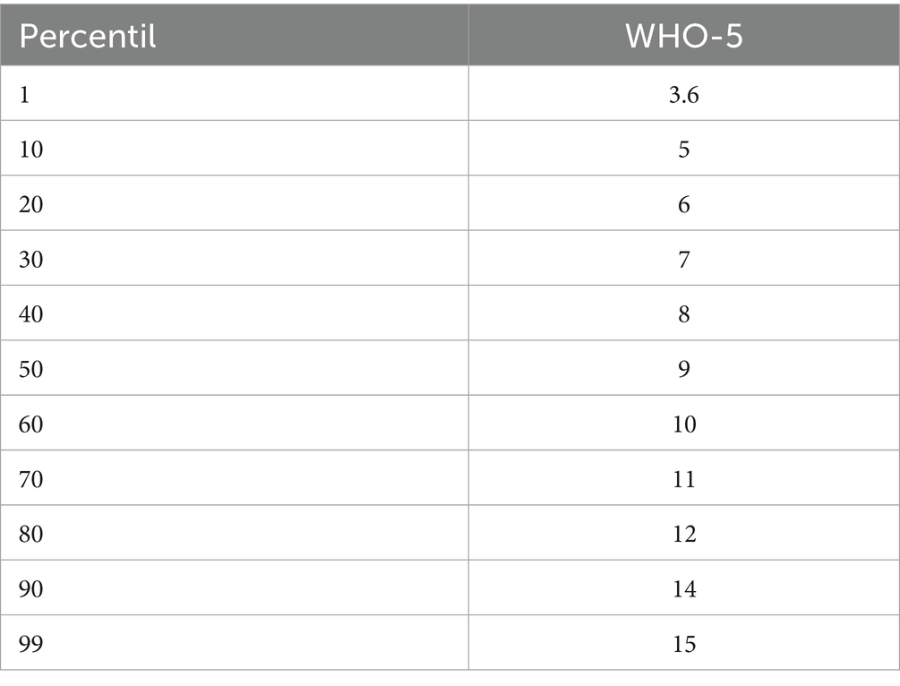 The table presents the general percentiles corresponding to the scores of the WHO-5 well-being index. Percentiles allow for the interpretation of the score distribution in the sample, facilitating the relative comparison of individual values with the rest of the evaluated population. These data help situate individuals within the overall distribution of well-being in the population and are useful for classifying levels of well-being according to percentile ranges (Table 7).