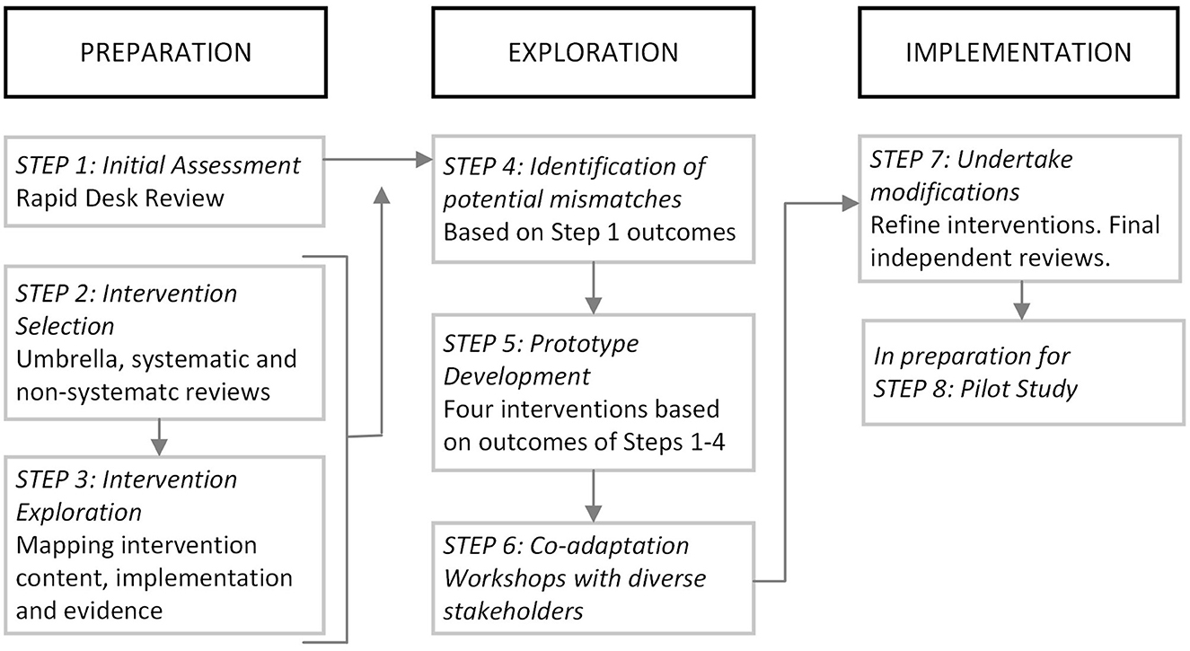 Our work followed the Adapt framework, specifically Movsisyan et al.'s (69) steps 1–7 for adapting complex population health interventions to new contexts and Moore et al.'s (67) decision pathways for when new interventions or new intervention components should be developed for new contexts. The Adapt steps move from intervention exploration and adaptation to preparation to implementation. Figure 1 shows how our phases of work aligned with these steps. Additional frameworks were drawn upon at key points and are explained below.