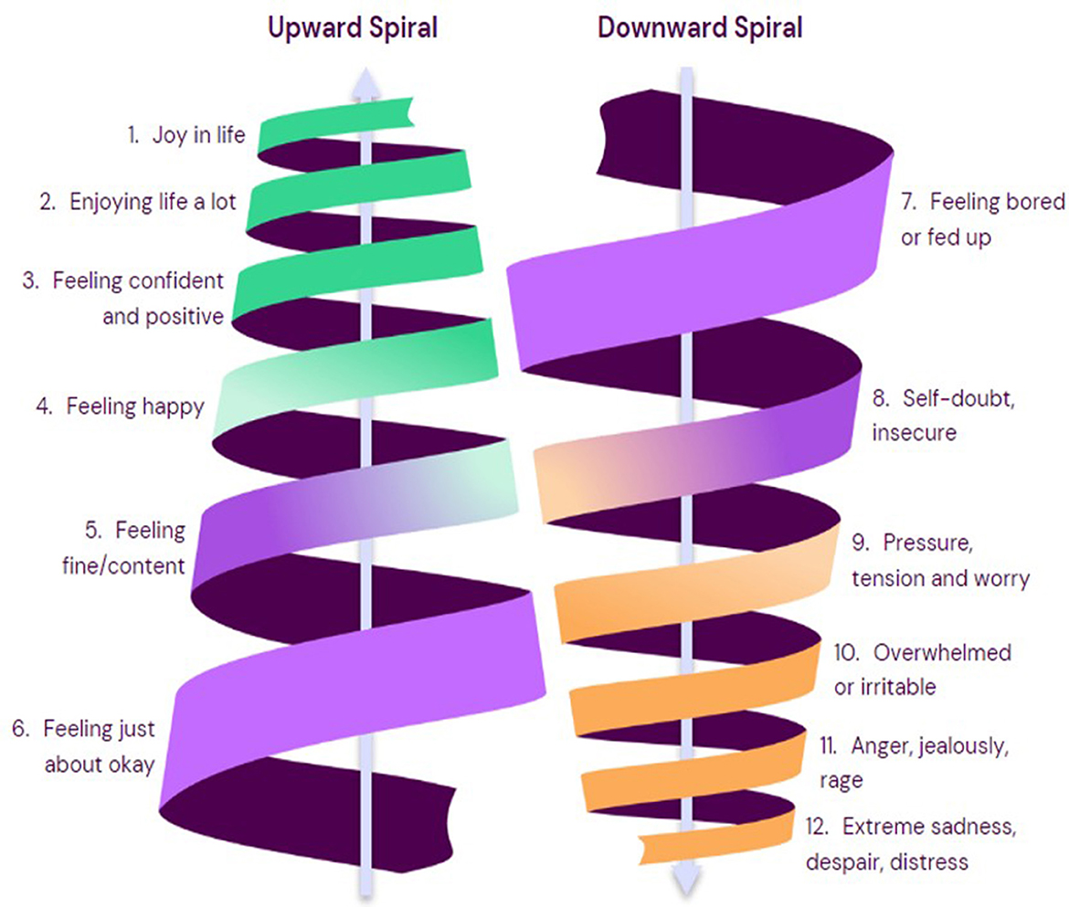 To take to co-production, we created prototypes for four interventions, anticipated to function synergistically as a whole school program for adolescent mental health (Table 2). We scrutinized the SEHER and SHAMIRI manual for content and approaches that could be used in Intervention 1 prototype (SAMA for Youth). The extracted content is reported in Supplementary File 7. Given the lack of available intervention manuals from the umbrella review, we drew on additional evidence of common components of effective adolescent school mental health programs, specifically Clarke et al. (91); Gimba et al. (92), Skeen et al. (93) and WHO's Helping Adolescents Thrive Toolkit (94), as well as the Wellcome Trust's report of active ingredients for prevention and early intervention in youth anxiety and depression (95, 96). Supplementary File 8 shows our synthesis of common effective mechanisms across these reviews and how these mapped to our final intervention 1 prototype. The stated aim for prototype intervention was to help adolescents build practical skills for wellbeing and for managing early symptoms of anxiety and depression via an eight-week classroom-based psychoeducation program. This was designed to be delivered to standard class size (n = 30–40) in 9th grade (14–15 year) by a lay counselor embedded in the school. It utilized a concept of a “SAMA Emotion Spiral” (Figure 2) reflecting normal changes in mood, upwards and downwards, and that awareness of “how we are” can help us respond helpfully.