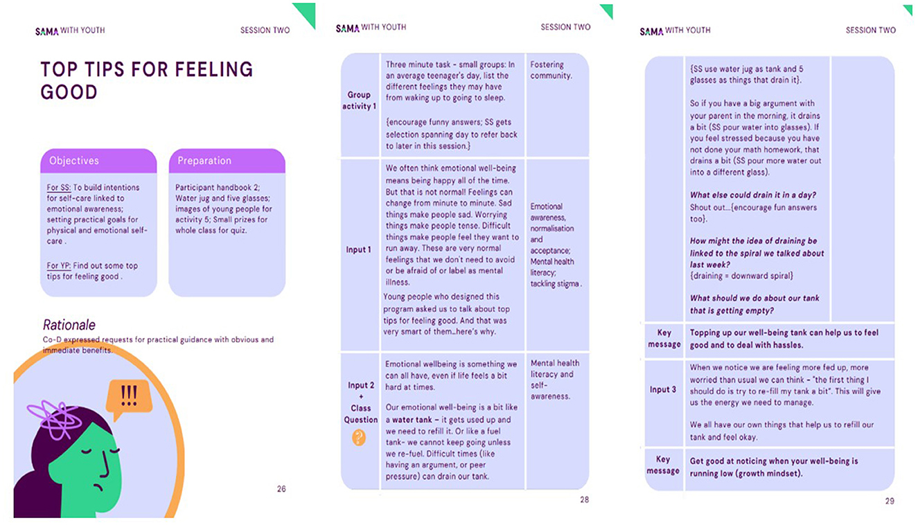 Most stakeholders endorsed highly visual mini booklets to support youth self-reflection and content consolidation. Teachers and head teachers suggested vignettes as a cultural and age-appropriate discussion tools that minimize personal disclosures and vulnerability. Both adolescent girls and boys wanted sessions to be mixed-gender, different to typical classes, informal and highly interactive with many opportunities for peer-to-peer engagement, including role playing, group discussions, problem solving tasks, discussing example scenarios, peer-to-peer teaching as well as time for setting personal goals and personal reflection. However, adolescents deemed some issues as unsuitable for peer discussions. Some boys worried about discussing boy/girl relationships and some girls said they would feel uncomfortable sharing personal views on “what helps students feel calm and happy.”