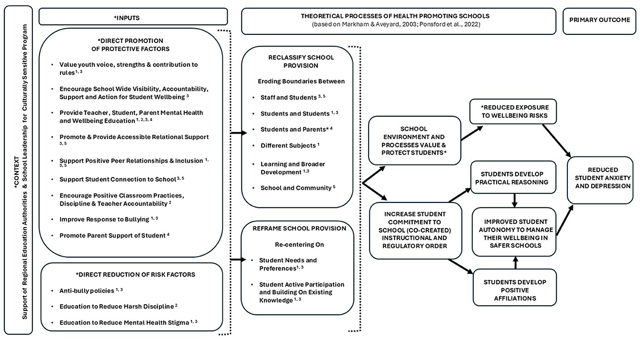 For clarity, henceforth, we refer to our plans for a whole school program with interrelated interventions each with components. Our primary outcome for the eventual program was youth anxiety and depression [as per our study protocol (63)]. We planned to build on SEHER, extending the focus to adolescent anxiety, to target teachers and parents as key system actors, and to deliver a more comprehensive intervention of school climate improvement. We focused on these four targets (adolescents, teachers, parents, and school climate) as representative of individual, relational, and contextual influences on adolescent mental health that could be addressed via a whole school promotion and prevention program (59, 63). Our intentions were to positively disrupt proximal risky school and individual contexts, processes and/or mechanisms which were likely to be of relevance to adolescent anxiety and depression, and to promote those important to wellbeing (32). Programs aiming to induce change in social complex adaptive systems like schools need multilevel, synergistic action. Our a priori theoretical lens was Markham and Aveyard's (61) theory of health promoting schools which posits that being in a position to choose to function well and flourish is necessary to maximize one's health potential, acknowledging that for adolescent mental health this potential is subject to multiple influences. The theory proposes that schools can promote autonomy to function well via school organization, curriculum, and pedagogic practices.