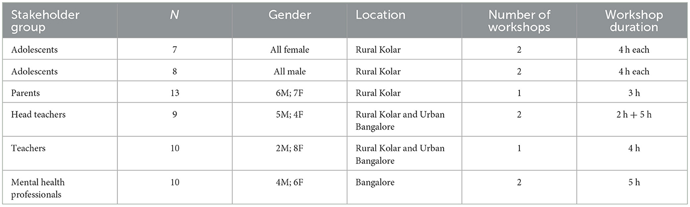 We recruited 57 stakeholder participants. Table 1 shows participant and workshop details. We had representation from four schools (both government and private). Mental health professionals were psychiatrists, clinical psychologists and psychiatric social workers and two representatives from NGOs who worked in school health and mental health.
