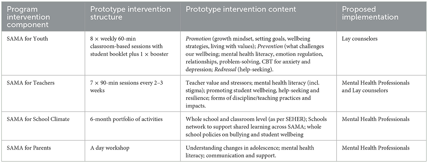 To develop intervention 3 prototype (SAMA with Schools), we drew upon SEHER's school climate intervention (59) but made several modifications. For example, we dropped the development of school policy on substance use but added one on school wellbeing, and we changed the focus of classroom workshops to mental health related issues (e.g., we dropped study skills content). We also drew minimally upon two further programs -the Gatehouse Project (101) and School Climate Improvement Resource Package (102). However, most content from these programs constituted mismatches either to our aims or resources (e.g., developing in-school monitoring and evaluation teams). Supplementary File 8 details how the content from each of these fed into our final prototype SAMA with Schools. This multi-component intervention was proposed to be delivered by a lay counselor over 6 months.