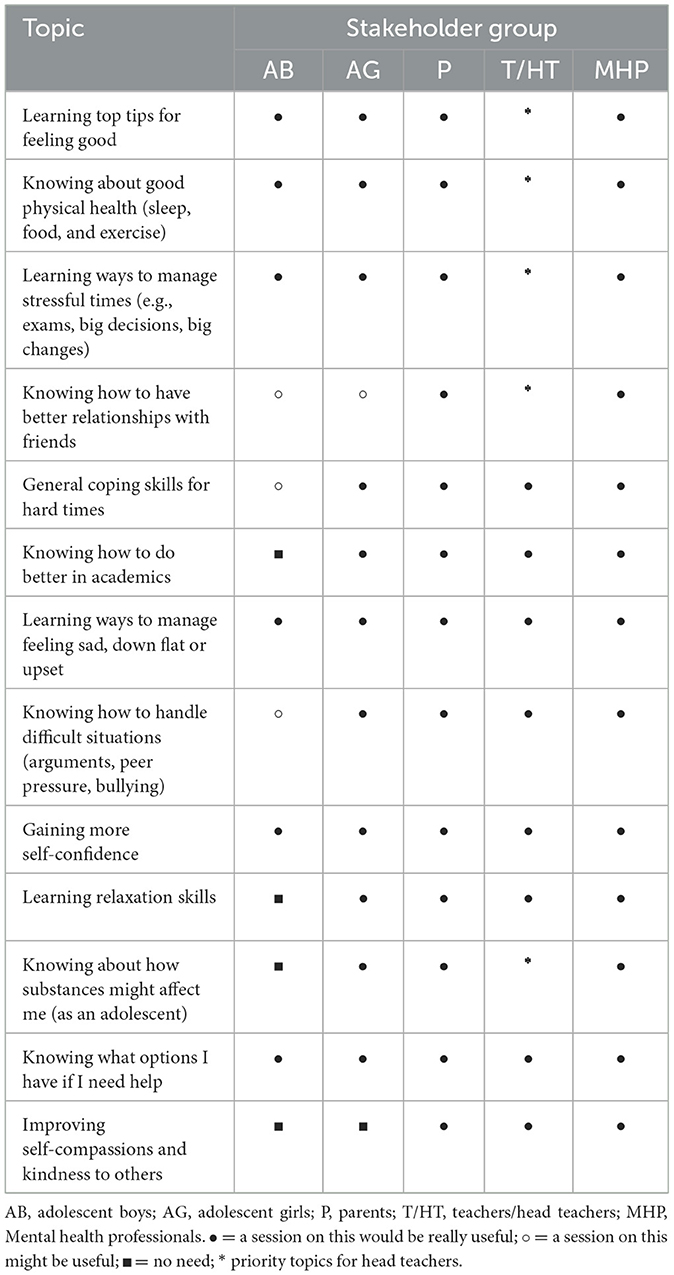 The intervention prototype content was endorsed and deemed necessary, but insufficient, by all other stakeholders, with varying views of priority content. This is shown in Table 3 where we distilled prototype content into key issues. Parents, teachers and mental health professionals requested additional coverage of technology addiction, living by values, sustaining focus on academic achievement and family issues. All adolescents said they would be uncomfortable discussing “when things are difficult at home” as this was a private matter for their family. Mental health professionals offered suggestions about addressing teacher-student bullying and some content for the psychology-focused sessions. They emphasized that values in Indian culture are highly personal and that adolescents should be offered a chance to articulate their own values at the start of the intervention. Adolescent boys requested content on improving self-confidence, defense mechanisms, practical ways to cope with stress, ways to understand and reach your goals, and top tips on how not to be anxious or disappointed. Clear, in-school, help-seeking pathways were also important to adolescent boys. Adolescent girls emphasized the need for sessions on how to distinguish between “good and bad” friends and how to maintain good friendships. Neither adolescent boys nor girls rated self-compassion as a necessary topic. Stakeholders broadly offered the same reasons for endorsing the prototype content which centered around the empowering of adolescents to understand and manage their own wellbeing by up-skilling them with mental health literacy, problem solving abilities and knowledge of help-seeking options. All stakeholders, including parents, stated that they felt SAMA for Youth was important and should be part of the school curriculum.