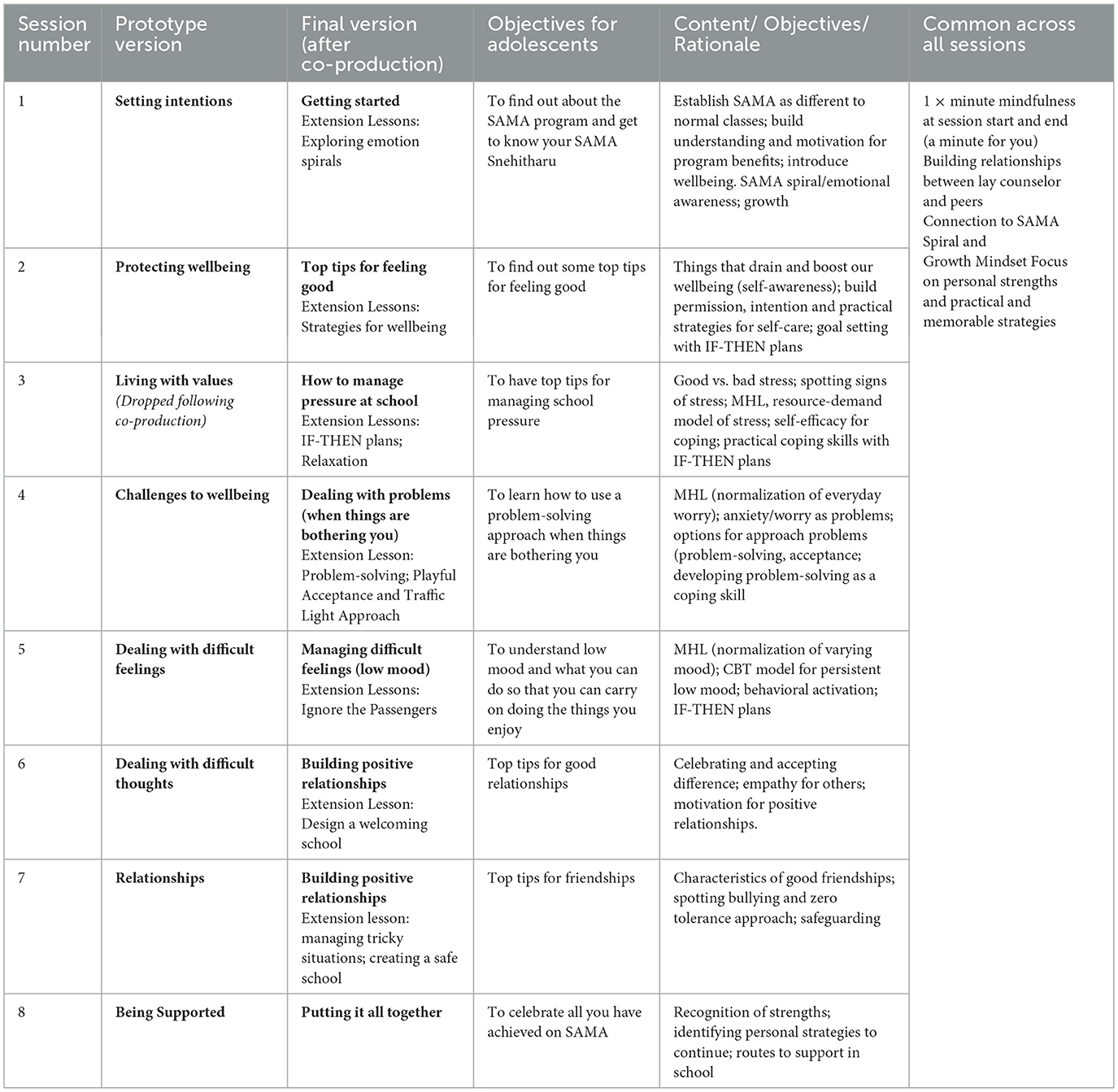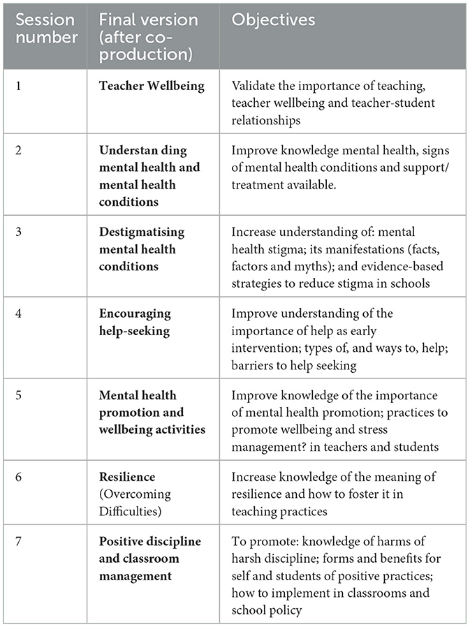 The aim of intervention 2 prototype (SAMA for Teachers) was to increase teachers' mental health literacy and teachers' use of positive classroom practices. This was created by first drawing upon the Canadian Go-To-Educator Training (89). Supplementary File 8 details the content mapping. We identified only a few mismatches. For example, the source intervention largely conceptualized mental health stigma as an individual attitude. Adaptation was needed to acknowledge the cultural and religious views and beliefs which shape Indian perspectives on the origins and nature of mental health (97). We drew upon other Indian manuals/resources, namely the White Swan Foundation's “Youth Mental Health: Teacher as Catalysts” (98) and Fortis' Mental Health in Classroom Curriculum (99) for culturally relevant examples and ways of talking about mental health literacy (e.g., concept of burden vs. stress, talking about “challenges” rather than “problems”). For intervention content to promote teachers' use of positive practices in the classroom, our manual searches identified the Positive Discipline and Classroom Management by the Center for Justice and Crime Prevention and the Department of Basic Education, Pretoria (100). Supplementary File 8 shows the content taken from this. Some mismatches were identified. For example, the Indian team felt more focus was needed to explore how teachers were affected by the expectations held by some Indian parents that schooling will administer tough (including corporal) discipline when needed. The final intervention 2 prototype proposed 7 × 90-min sessions delivered over 2–3-weeks (see Supplementary File 8).