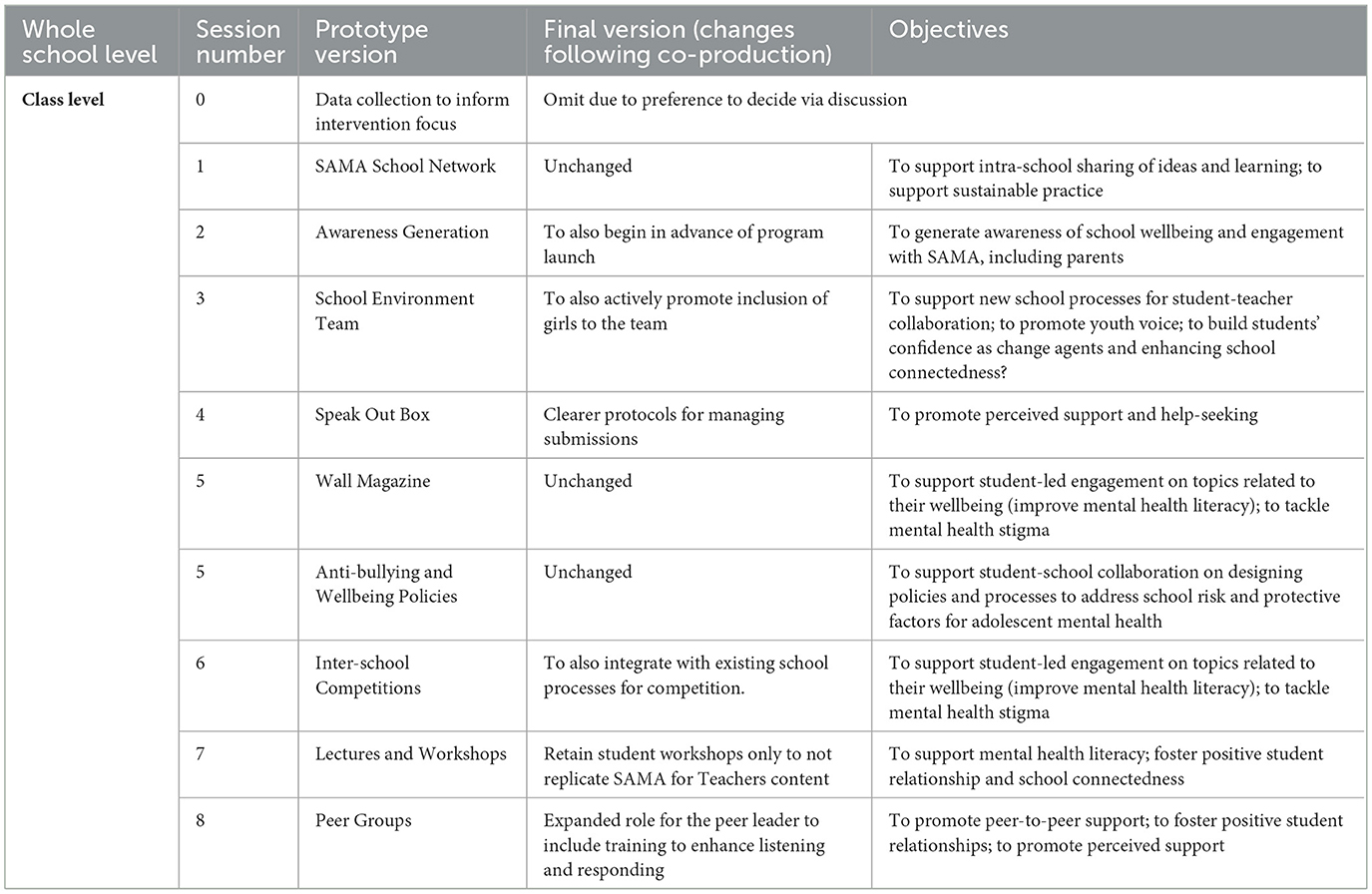 Step 6 confirmed acceptability of the intended aim of the SAMA program to reduce symptoms of anxiety and depression in adolescents. Informed by Step 6 outcomes, Step 7 involved modifying the prototypes to generate four final interventions that would constitute our SAMA whole school program, ready for feasibility testing. The content for these finalized interventions, which we detail below, was favorably reviewed by our independent local mental health experts (see Supplementary File 9). We planned to use the Reporting Adaptations and Modifications-Enhanced (FRAME) (77) to document how we had adapted candidate interventions from Step 2 prior to pre-feasibility testing. However, this was not meaningful as none of our final prototypes were based on any single existing program. Supplementary File 10 details our TIDieR checklist (105) for the whole school program and our Type 2 logic models for each intervention and likely moderating factors. Although Type 1 and 2 logic models are limited in their suitability for complex interventions (106), they are a useful organizing framework at a feasibility stage. Our logic models show the key intervention content and the hypothesized mechanisms of change leading to proximal outcomes. They also show the “Inner Context” moderators which we envisage may affect the change process.