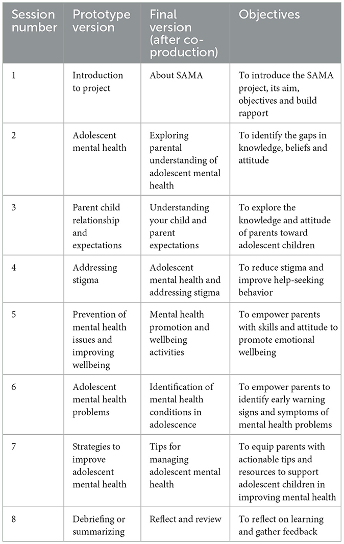 For intervention prototype 4 (SAMA with Parents), we explored the Early Adolescent Skills for Emotions (EASE; psychoeducation parent sessions) (103) and the Go-To-Educators Training (104), especially on addressing mental health stigma. However, much of the content of these programs was not aligned with our aims to improve parents' mental health literacy or were not compatible with the short duration that we were going to be able to engage parents. Some mismatches could be addressed. For example, the EASE program content on parental self-care was replaced with a short focus on self-management in times of high stress with their child. A substantial proportion of the intervention content was created from the significant professional and local knowledge of the NIMHANS team. The final prototype intervention (see Supplementary File 8) was proposed to be delivered as a half day workshop on school premises. The stated aim was to improve parental mental health literacy as a pathway to support adolescents.