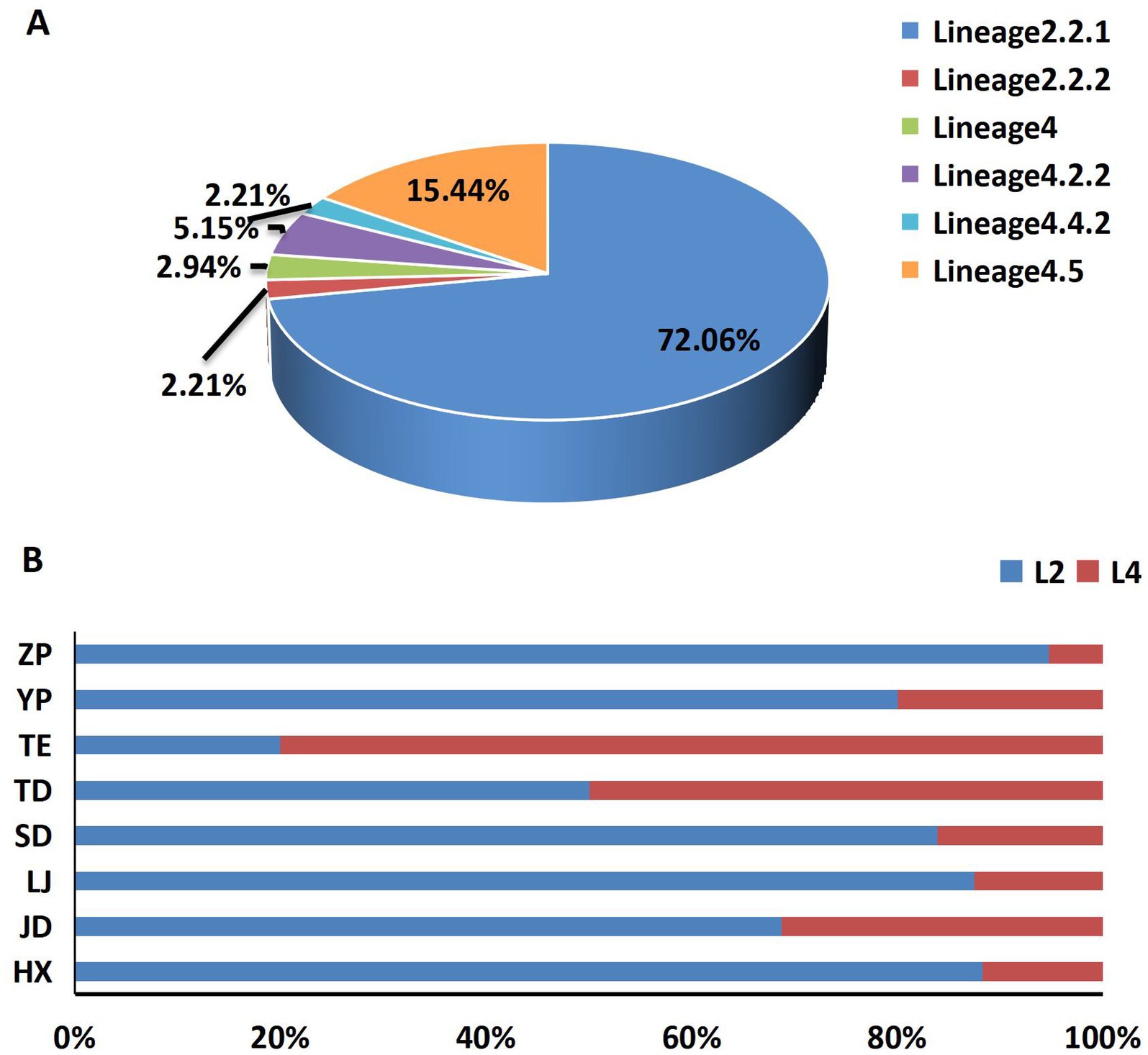Figure 1. The composition and distribution of lineages. (A) The composition of different lineages and sub-lineages, (B) the main lineages distribution among 8 townships.