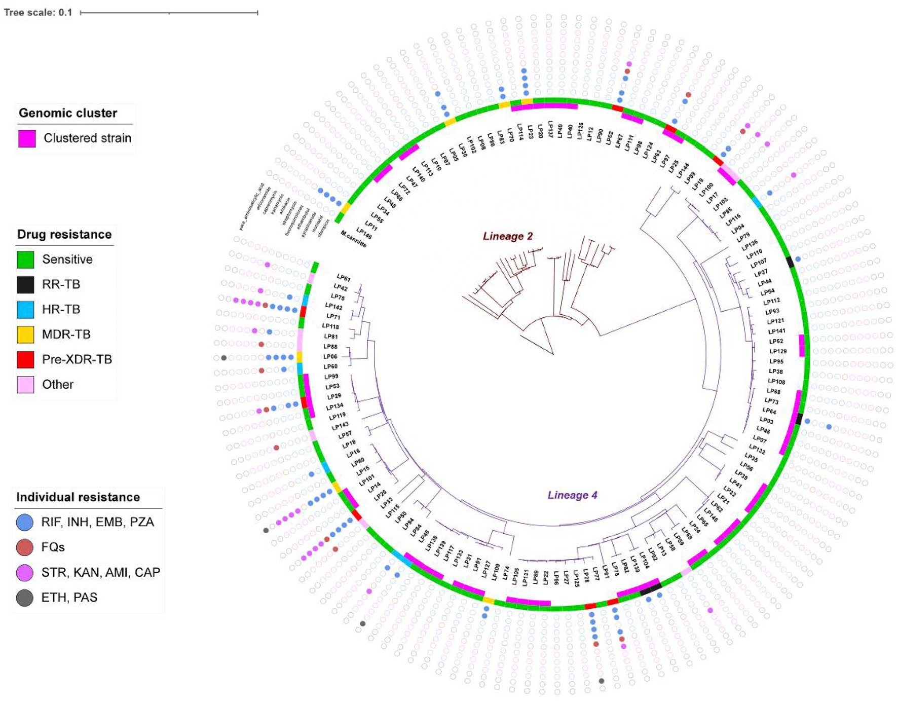 Figure 2. The maximum likelihood phylogeny tree of 136 strains. The inner branch indicates the genetic distance, the pink belt of inner circle indicates genomic-clustered strains differing by ≤12 single-nucleotide polymorphisms, the different color of middle circle indicates the drug resistant type and the outermost colored dots indicates the resistance to 11 anti-TB drugs. Mycobacterium canettii was used as an outgroup.