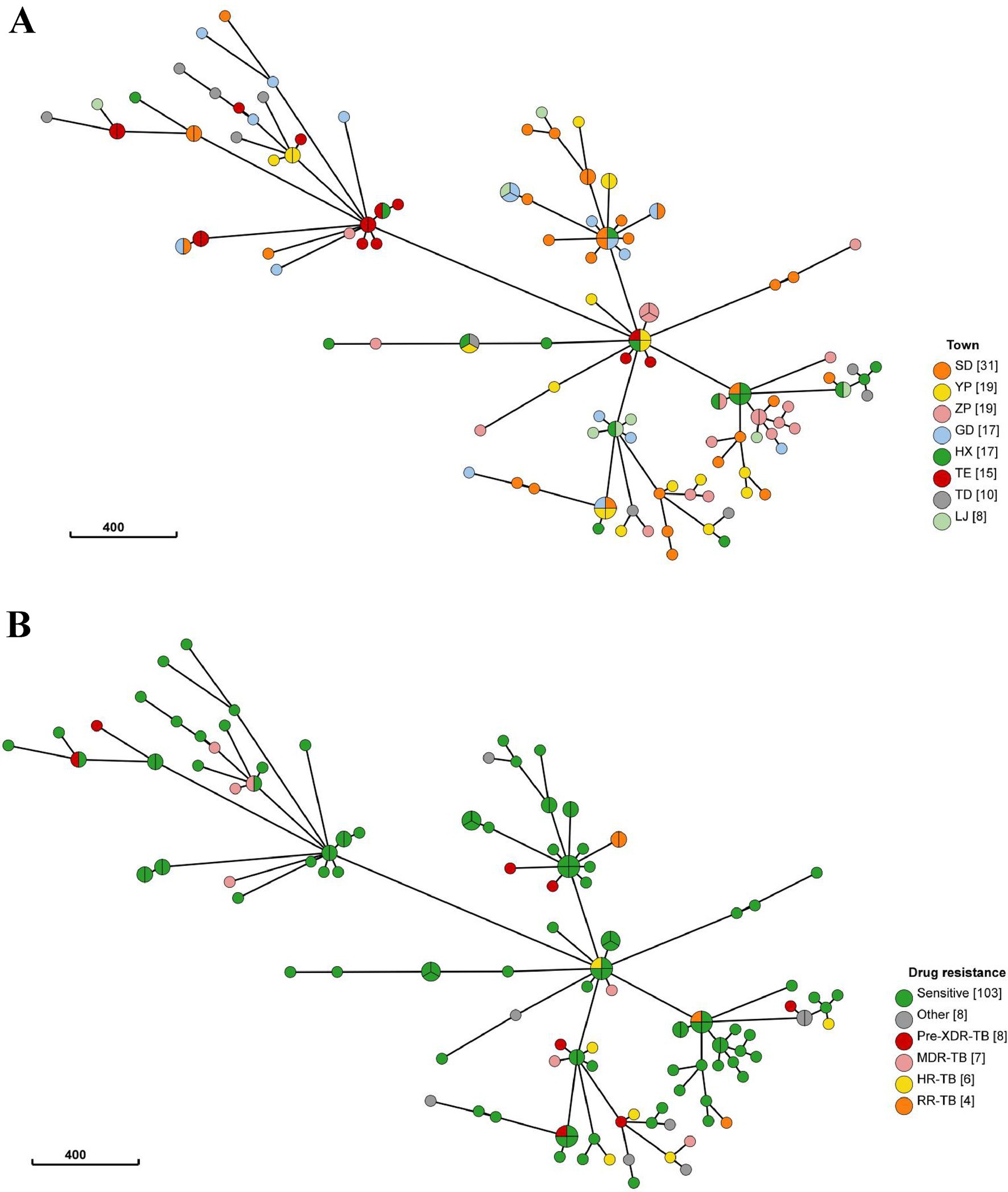 Figure 3. (A) The minimum spanning tree of 136 strains. The size of the circle represents the number of isolates in the cluster, the color of each circle represents the originated township of strain (TE, ZP, SD, YP were defined as high-burden townships), circle compromised of different color represents the cross-township transmission of this cluster. (B) The minimum spanning tree of 136 strains, The size of the circle represents the number of isolates in the cluster, the color of each circle represents drug resistance type of strains, circle compromised of non-green color represents the cluster contained drug-resistant strains.