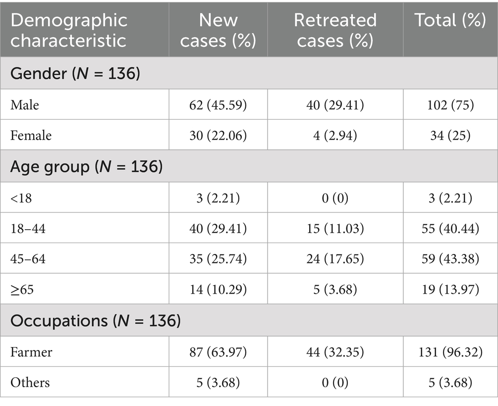 From January 2019 to July 2020, we collected 145 Mycobacterium tuberculosis isolates from 138 patients (6 patients provided multiple isolates), two isolates were excluded from subsequent analyses due to sequencing failure (n = 1) and contamination (n = 1). Finally, 136 patients (36.03% were smear-negative cases) included analysis. Among them, 75.0% were male, 96.32%were farmers, 67.65% were new cases, and the mean age ± standard deviation (SD) was 46.48 ± 14.30 years (Table 1).