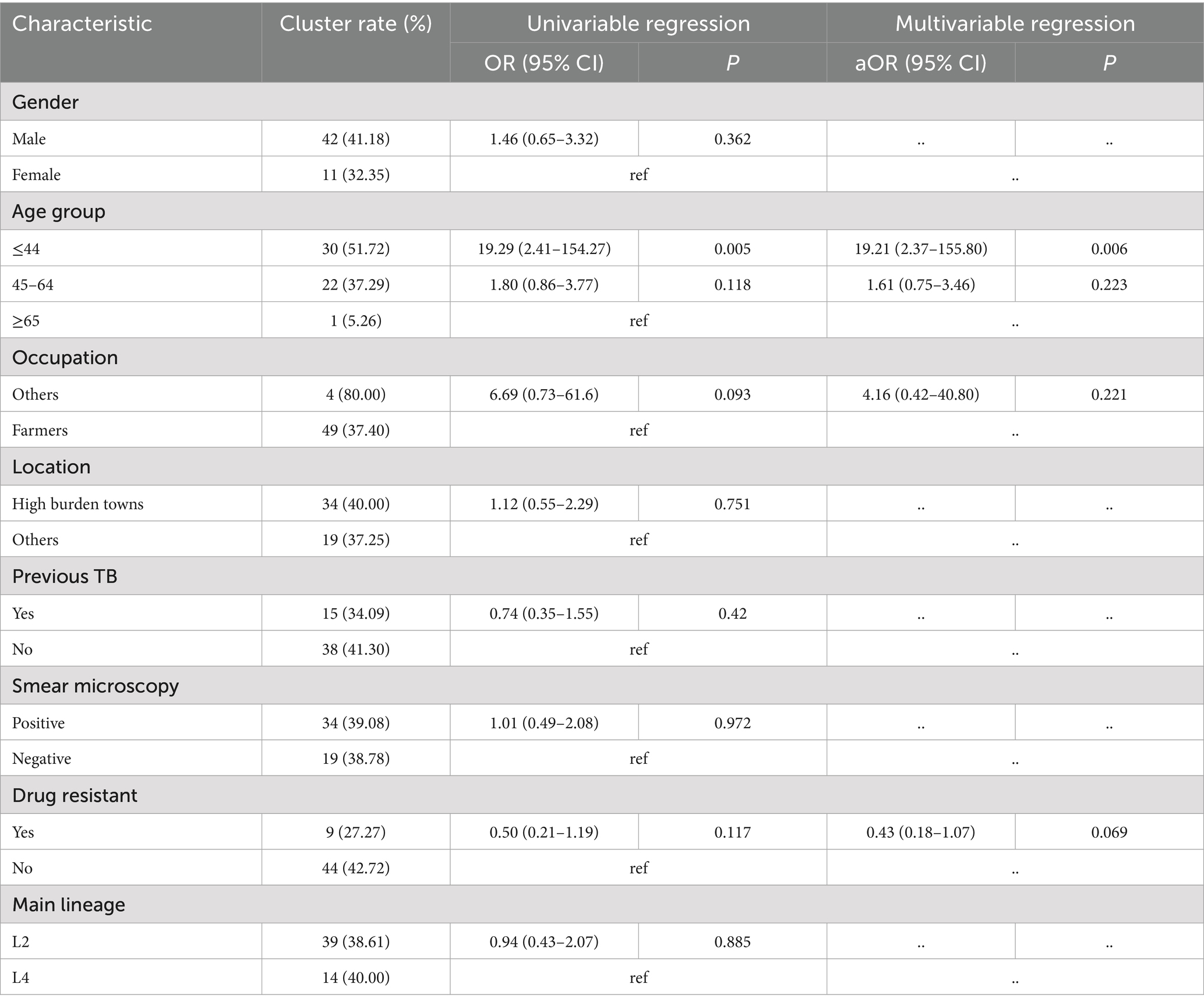 Methods: We conducted a retrospective study using strains isolated from L County between January 2019 and July 2020. Demographic data of patients were retrieved from National Tuberculosis Information Management System. A whole genome sequencing-based clustering analysis was performed to assess the transmission characteristics of pulmonary TB in L County. Univariate and multivariate logistic regression analyses were employed to identify potential risk factors associated with clustering.