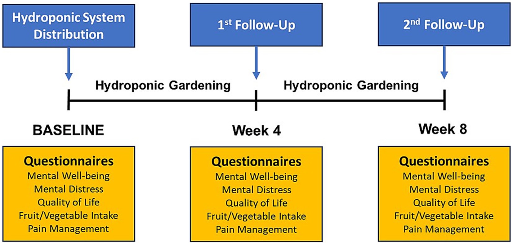 Demographic and baseline data were collected at the start of the study, including age, sex, race/ethnicity, socioeconomic status, type of insurance, medication for psychological issues, residence type, prior engagement in gardening, and weekly outdoor activity. Mental wellbeing, mental distress, quality of life, fruit and vegetable consumption, and pain management were assessed at baseline, 4 weeks, and 8 weeks during visits to the outpatient infusion center.