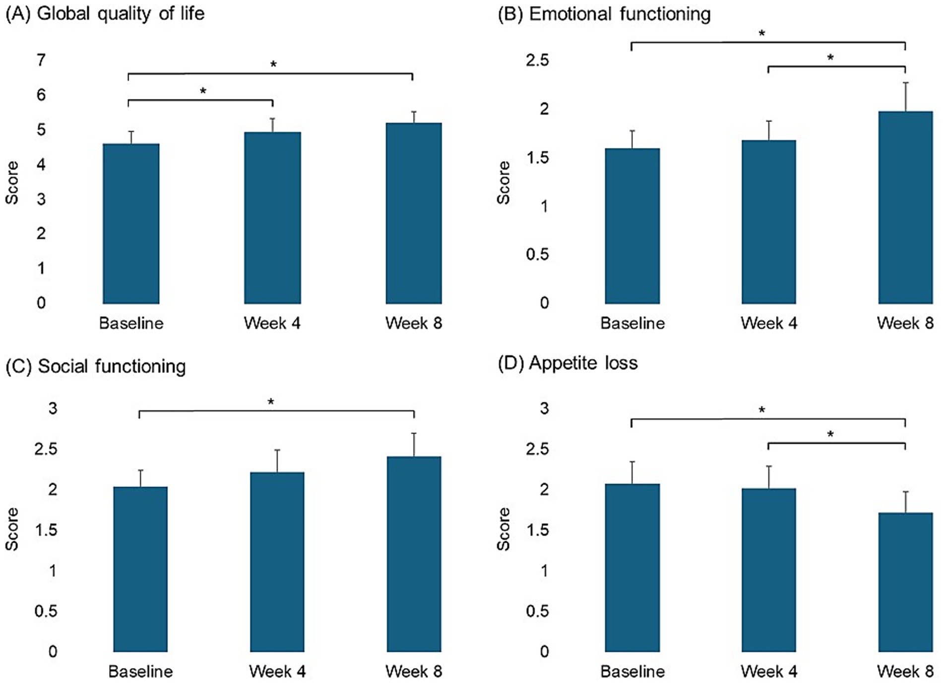 The global quality of life showed a significant improvement at week 4 (Figure 3) with an increase over the study period (p-trend < 0.001) (Table 3). Specifically, emotional and social functioning scores showed significant improvements at week 8 with a linear increase (p-trend = 0.001 and p-trend = 0.010, respectively), while appetite loss scores decreased significantly at week 8 with a continuous reduction in scores over the 8 weeks (p-trend = 0.007) (Table 3 and Figure 3).