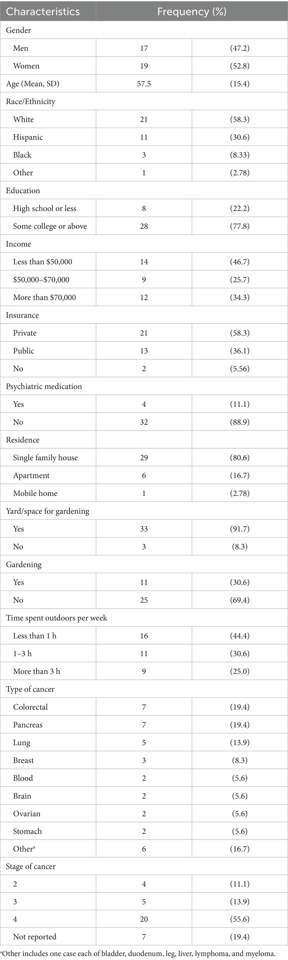 Among the 36 participants in the study, 47.2% were men and 52.8% were women, with an average age of 57.5 years. The majority of participants were White (58.3%) and Hispanic (30.6%). Most participants had some college education or higher. In terms of insurance, 58.3% had private insurance, while 36.1% had public insurance. The majority of participants (88.9%) had not taken psychiatric medication. Furthermore, 80.6% of participants lived in single-family houses, and 91.7% had a yard or space for gardening. Despite this, 69.4% of participants were not engaged in gardening, and 44.4% spent less than 1 h outdoors per week, while 25.0% spent more than 3 h outdoors per week (Table 1).