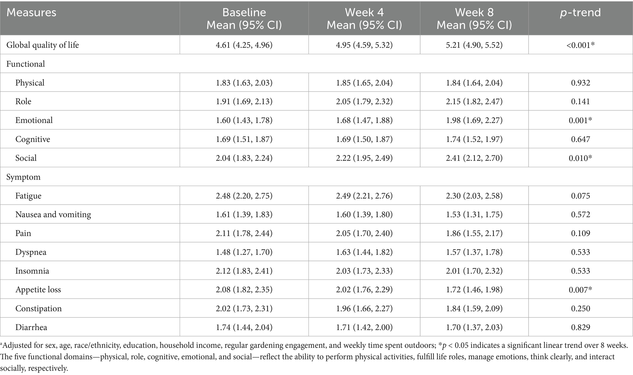 Descriptive statistics summarized demographic and behavioral characteristics to provide a comprehensive overview of the participant population and their baseline characteristics, with means and standard deviations for continuous variables and frequencies and percentages for categorical variables. Changes in health-related outcomes (mental wellbeing, distress, quality of life, fruit and vegetable consumption, and pain management) at baseline, 4 weeks, and 8 weeks were assessed using Generalized Estimating Equations (GEE) to account for within-subject correlations over time. The GEE approach is particularly suitable for repeated measures data, as it adjusts for the correlation between repeated observations from the same subject, providing more accurate standard error estimates and confidence intervals. The GEE model was implemented using PROC GENMOD with the REPEATED statement and subject identifier for the repeated measurements of questionnaire scores from each subject, allowing the use of robust error variances to estimate confidence intervals. This method ensures that the analysis accounts for the variability within individual participants over time. Models were adjusted for potential confounders including age, sex, race/ethnicity (White and non-White), education level (high school or less, some college or above), income, prior gardening engagement, and time spent outdoors in a week. All analyses were conducted using SAS software (version 9.4; SAS Institute Inc., Cary, NC, USA), with significance set at p < 0.05.