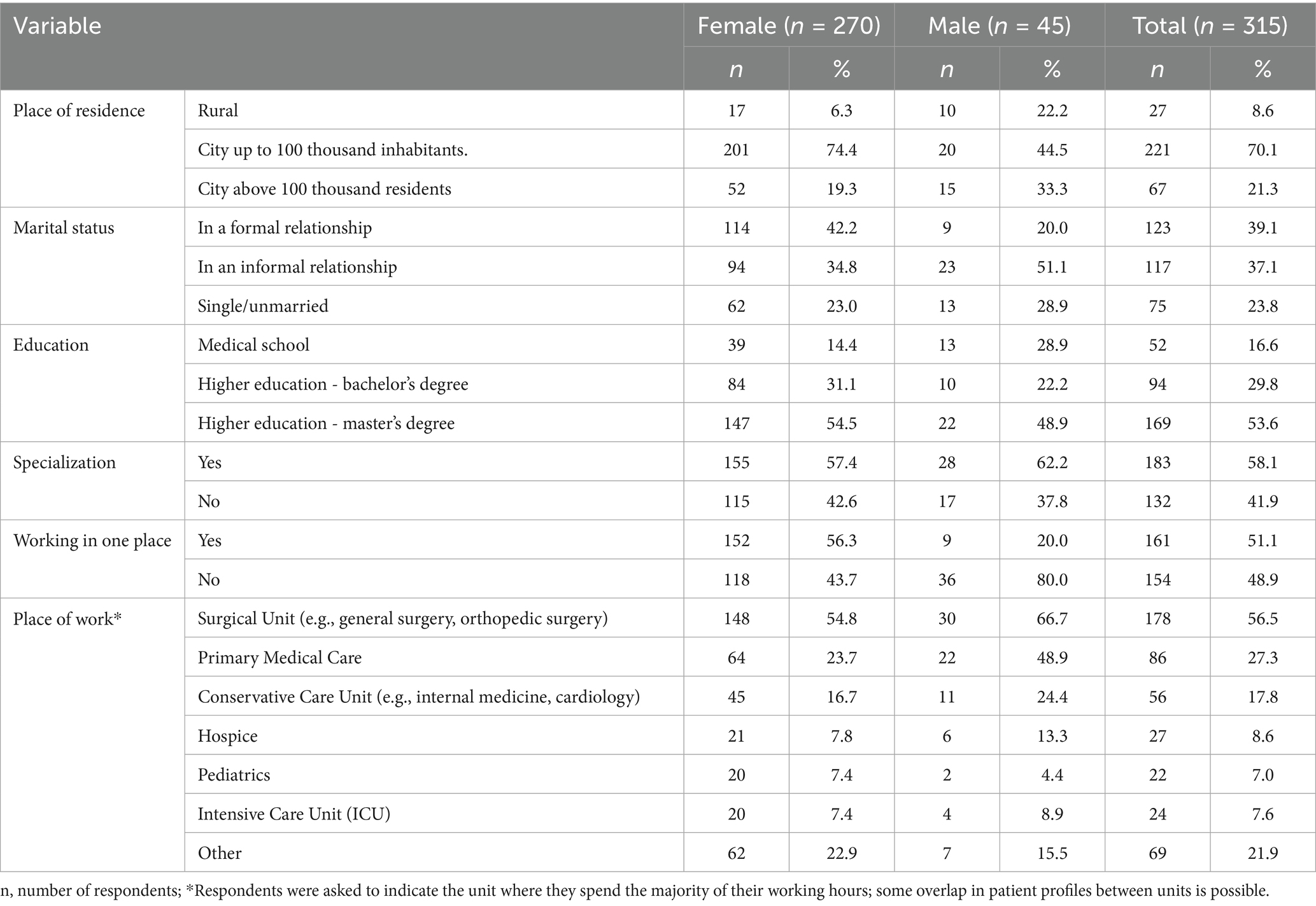 A total of 315 nurses participated in the survey, with the vast majority of respondents (85.7%) being women. The average age was 40.5 years (SD = 10.7). The dominant group was: living in a city of up to 100,000 residents (70.1%), in a formal relationship (39%), with a master’s degree (53.3%) and specialization (58.1%). The average length of service was 17.9 years (SD = 11.4). Most respondents worked: in a single workplace (51.1%) and in a surgical department (56.5%). Respondents were asked to indicate the unit where they spend the majority of their working hours; some overlap in patient profiles between units is possible. (Table 1).