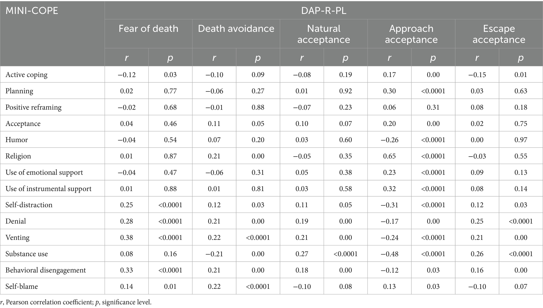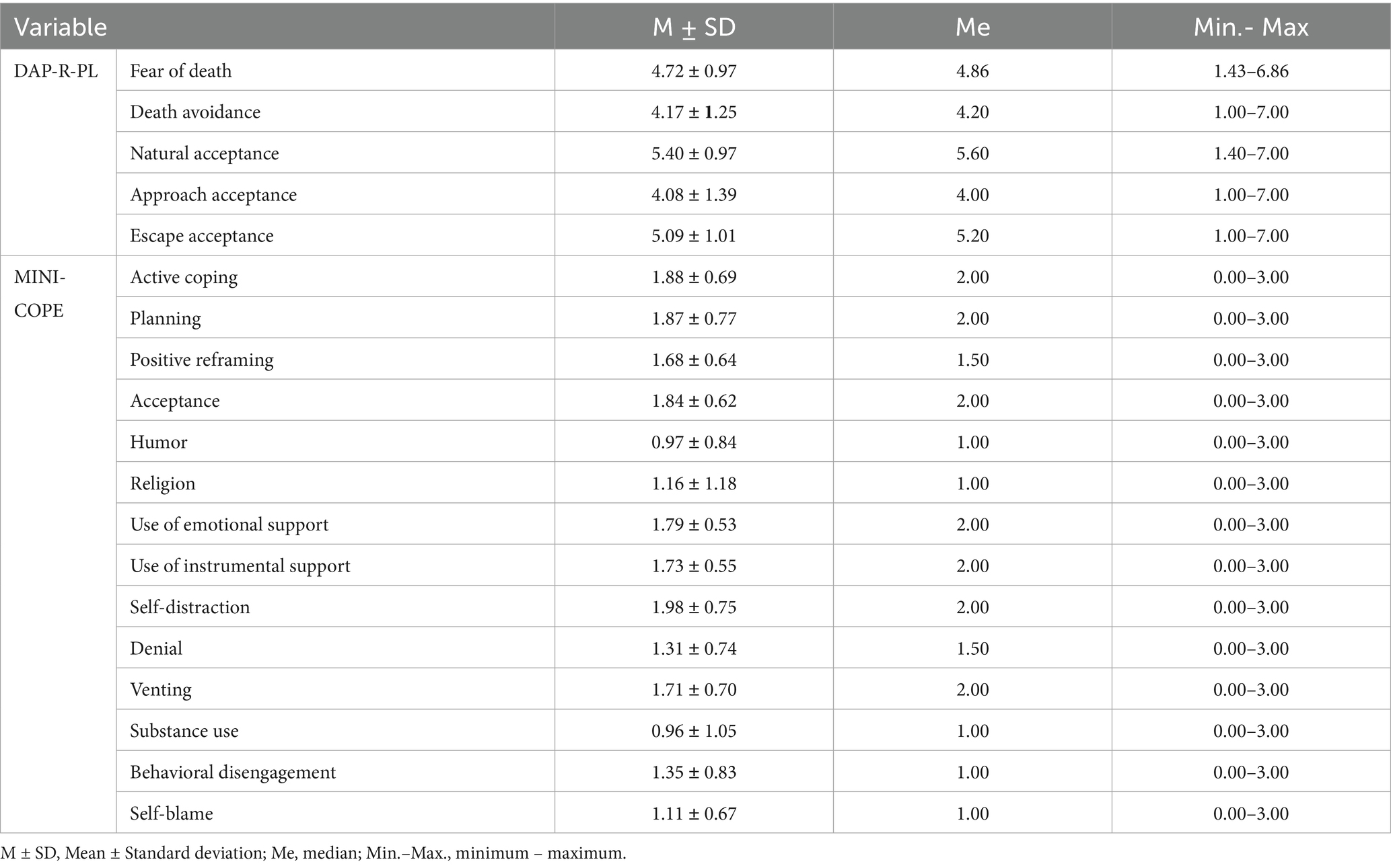 Table 2. Descriptive statistics of attitudes toward death on the DAP-R-PL and MINI-COPE stress coping strategies scales.