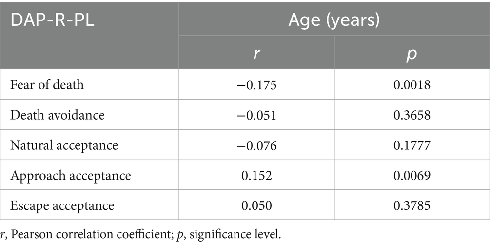 The study analyzed the relationship between nurses’ choice of attitudes toward patient death according to the DAP-R-PL and selected sociodemographic variables (age, gender, place of residence, marital status). The data analysis showed a statistically significant relationship between age and nurses’ attitudes toward patient death according to the DAP-R-PL. The study noted a weak negative correlation between the subjects’ age and fear of death (p = 0.0018) once a weak positive correlation between age and Approach Acceptance (p = 0.0069). There were no statistically significant correlations between age and other attitudes toward death according to the DAP-R-PL (Table 3).