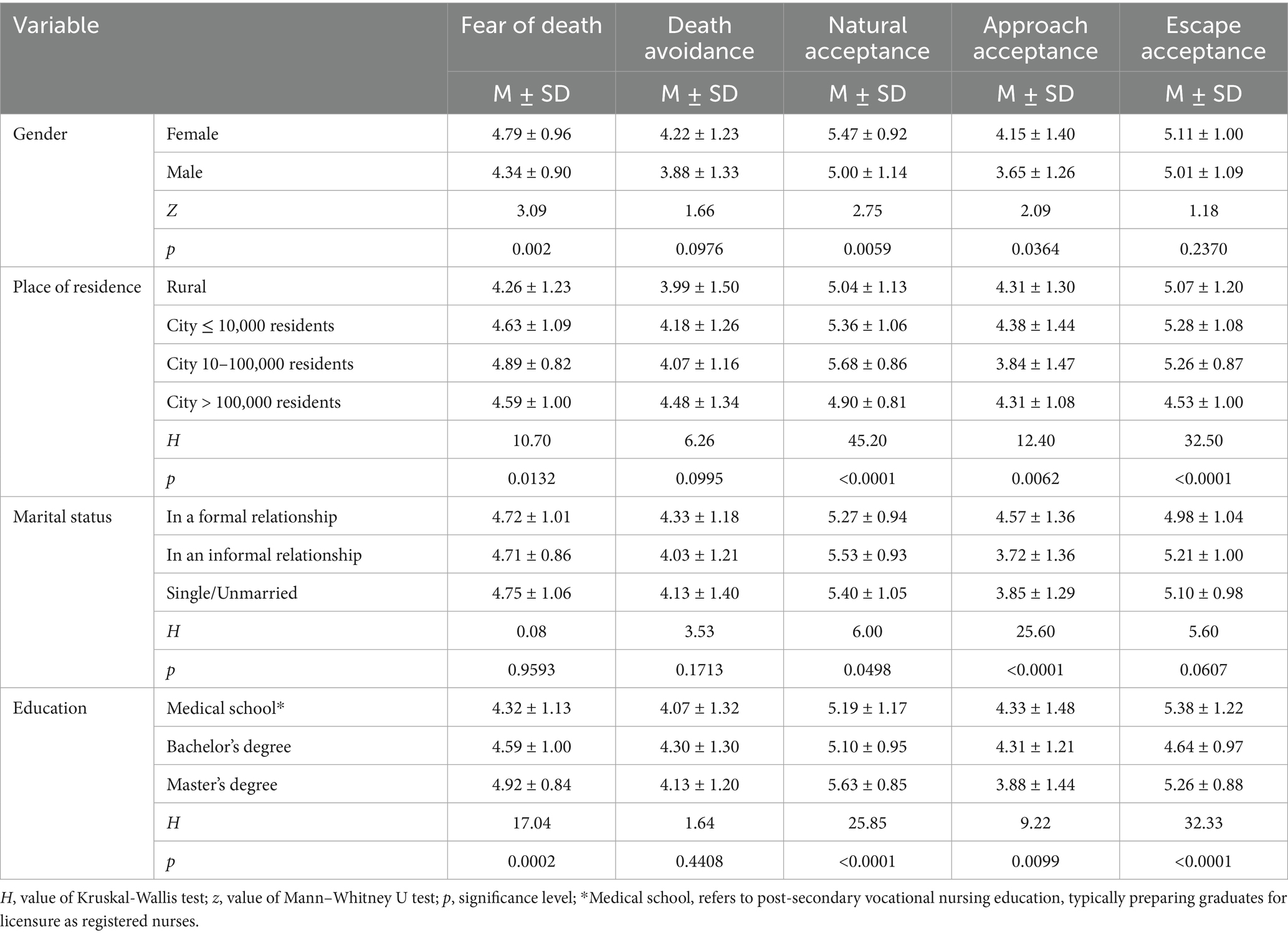 Analysis of the data showed statistically significant relationships between marital status and nurses’ attitudes toward patient death according to the DAP-R-PL. The study noted significant differences between respondents with different marital status for attitudes toward death: Natural Acceptance (p = 0.0498), Approach Acceptance (p < 0.0001). Analysis of the data showed statistically significant differences regarding nurses’ attitudes toward patient death according to DAP-R-PL according to respondents’ marital status. It was shown that Natural Acceptance was more often used by those living in an informal relationship than those in a formal relationship (p = 0.0477) In the case of Approach Acceptance, it was those living in a formal relationship who chose this attitude toward death more often than those living in an informal relationship (p < 0.0001) and then those who were single (p = 0.0009) (Table 4). Analysis of the data showed statistically significant differences in attitudes toward patient death according to the DAP-R-PL depending on the respondents’ education. The study showed statistically significant differences between education and Fear of death (p = 0.0002), Natural Acceptance (<0.0001), Approach Acceptance (p = 0.0099) and Escape Acceptance (p < 0.0001) (Table 4).