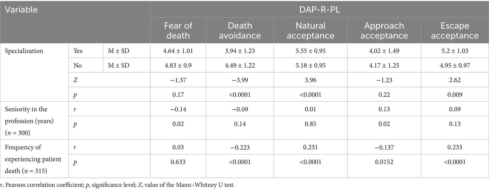 The Death Attitude Profile-Revised (DAP-R) conceptualizes five dimensions of attitudes toward death: fear of death, death avoidance, natural acceptance, approach acceptance, and escape acceptance (5, 6). Natural acceptance reflects viewing death as a normal, inevitable part of life, often linked to cultural or religious beliefs and associated with adaptive coping strategies. In contrast, escape acceptance frames death as a release from suffering, which may be understandable in palliative care contexts but can also indicate emotional burden or professional burnout.