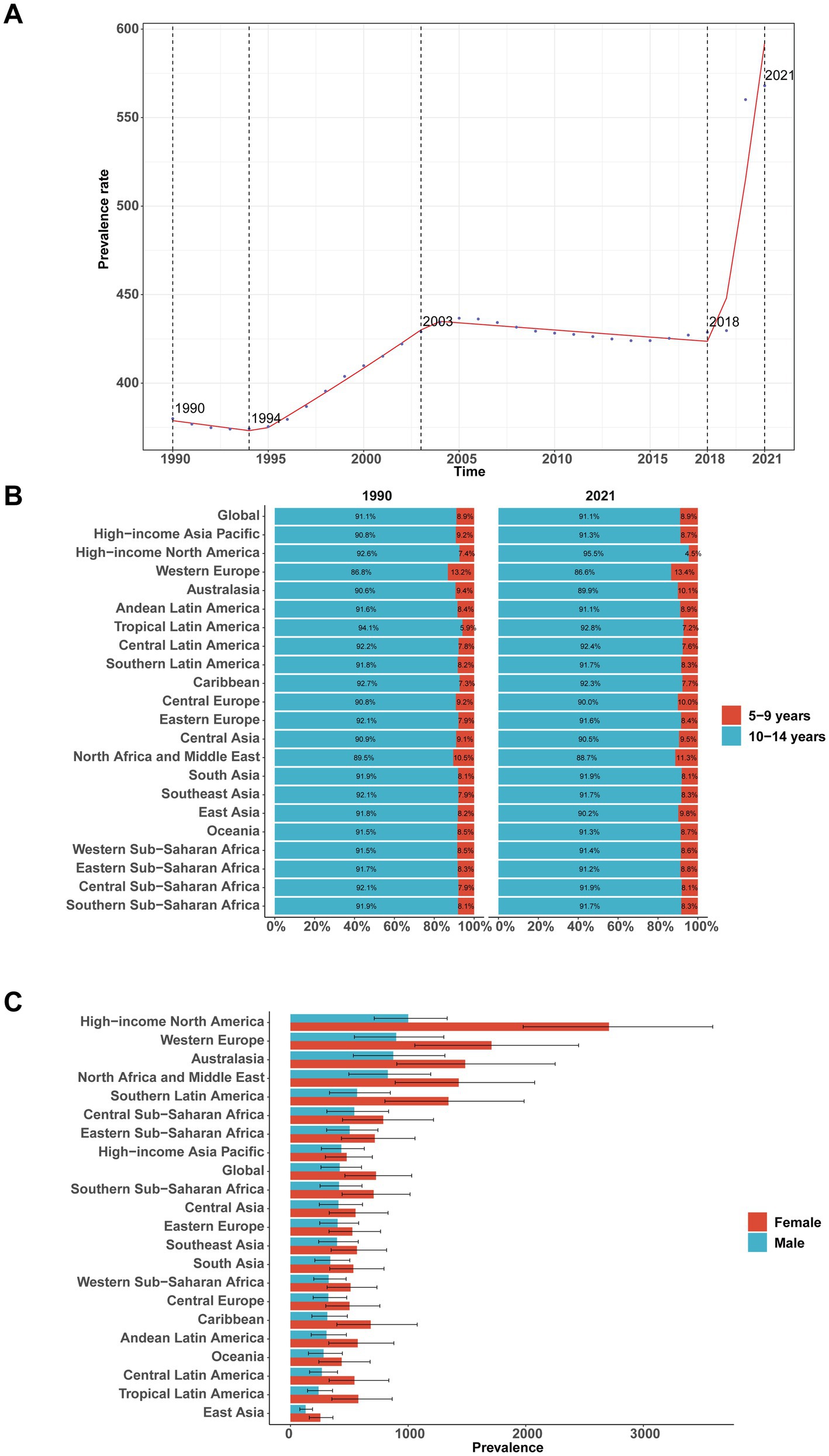 Figure 1. Global and regional prevalence of major depressive disorder among children aged 5–14 years, 1990–2021. (A) Global prevalence rate over time. (B) Composition of prevalence by age group (5–9 vs. 10–14 years) in 1990 and 2021 across GBD regions. (C) Sex-specific prevalence by region in 2021.