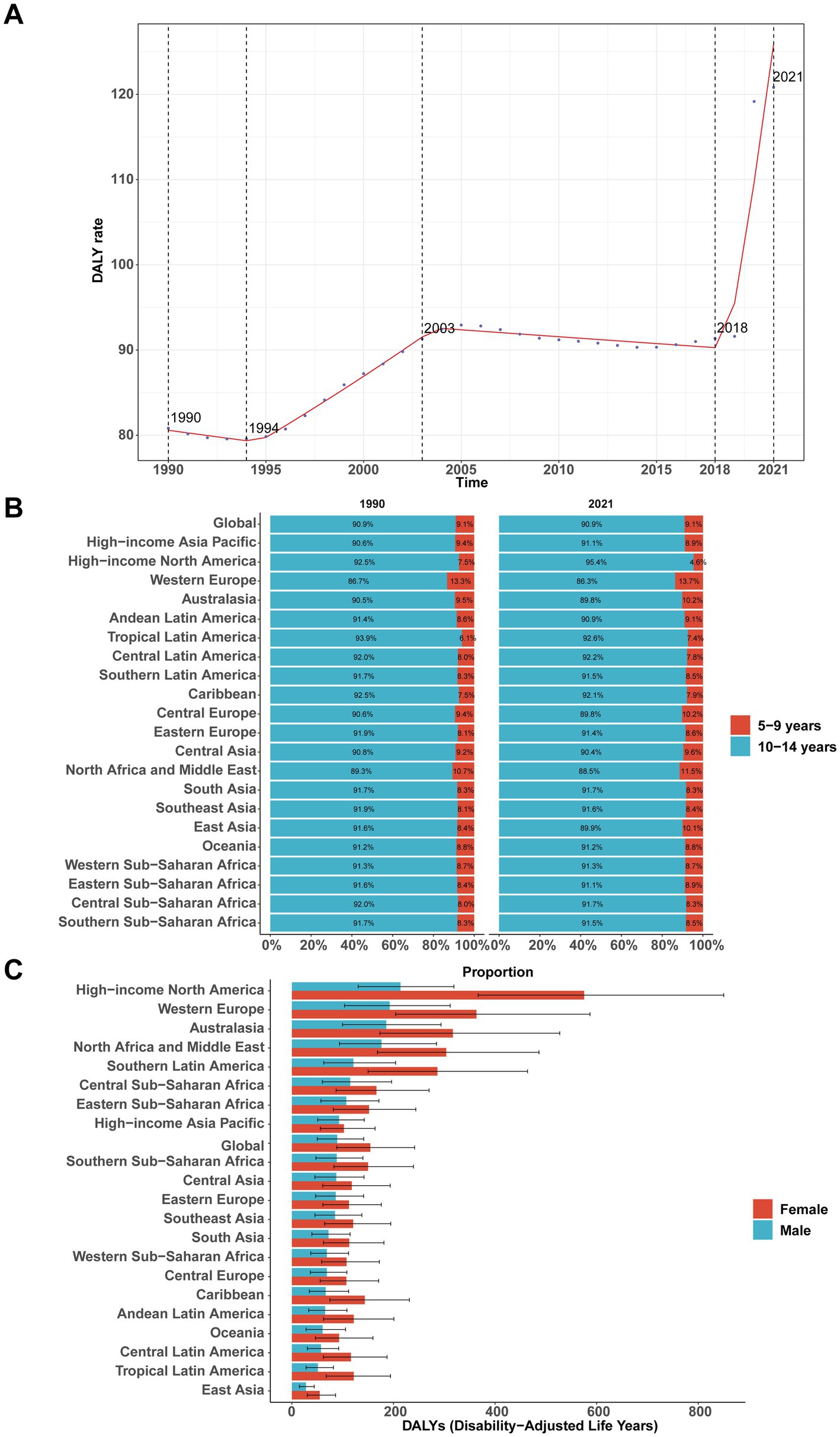 Figure 3. Global and regional disability-adjusted life years (DALYs) of major depressive disorder among children aged 5–14 years, 1990–2021. (A) Global DALY rate over time. (B) Composition of DALYs by age group (5–9 vs. 10–14 years) in 1990 and 2021 across GBD regions. (C) Sex-specific DALYs by region in 2021.