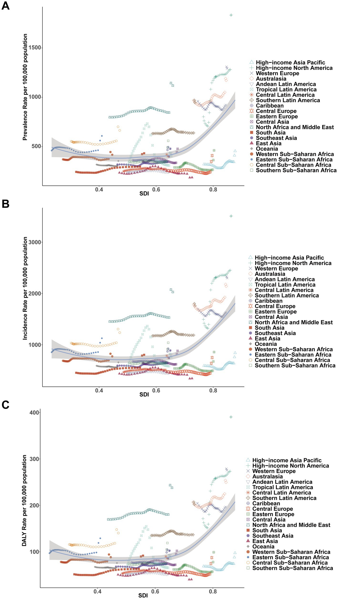 Figure 4. Association between prevalence, incidence, and disability-adjusted life years (DALYs) rates of childhood major depressive disorders and regional Socio-demographic Index (SDI), 1990–2021. (A) Prevalence rate. (B) Incidence rate. (C) DALY rate.